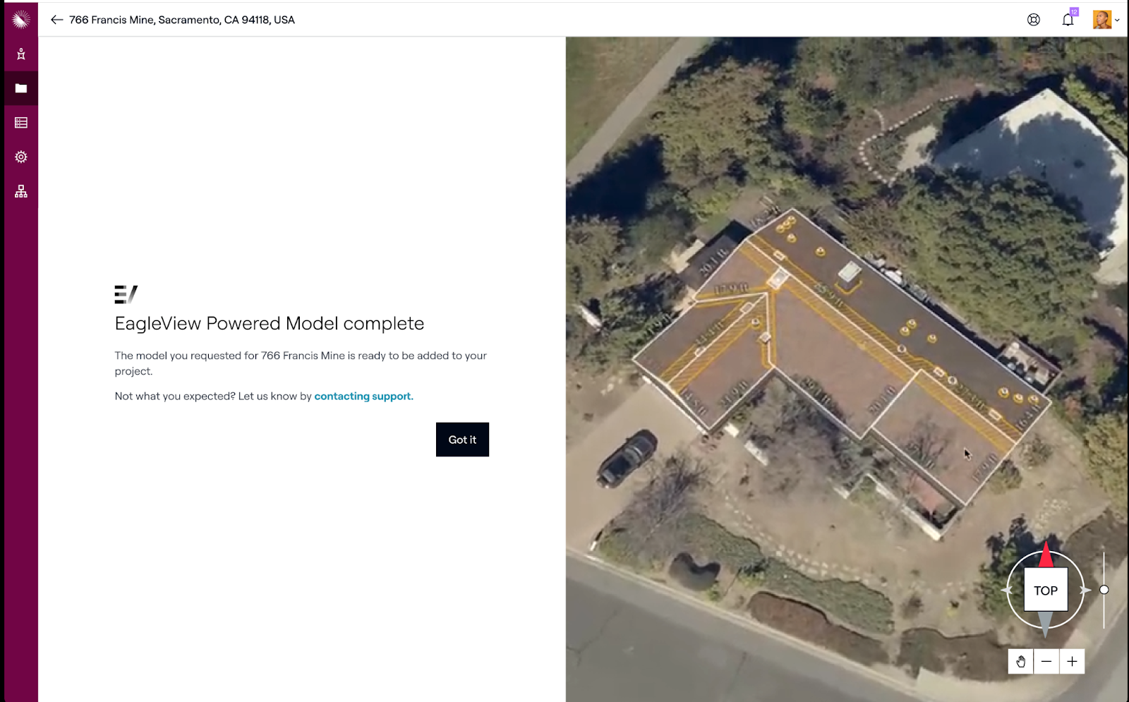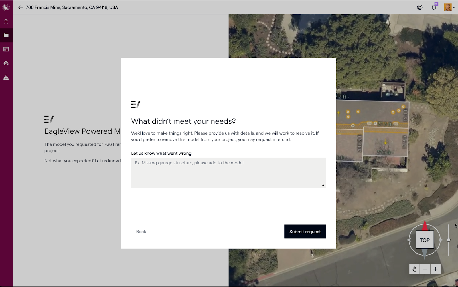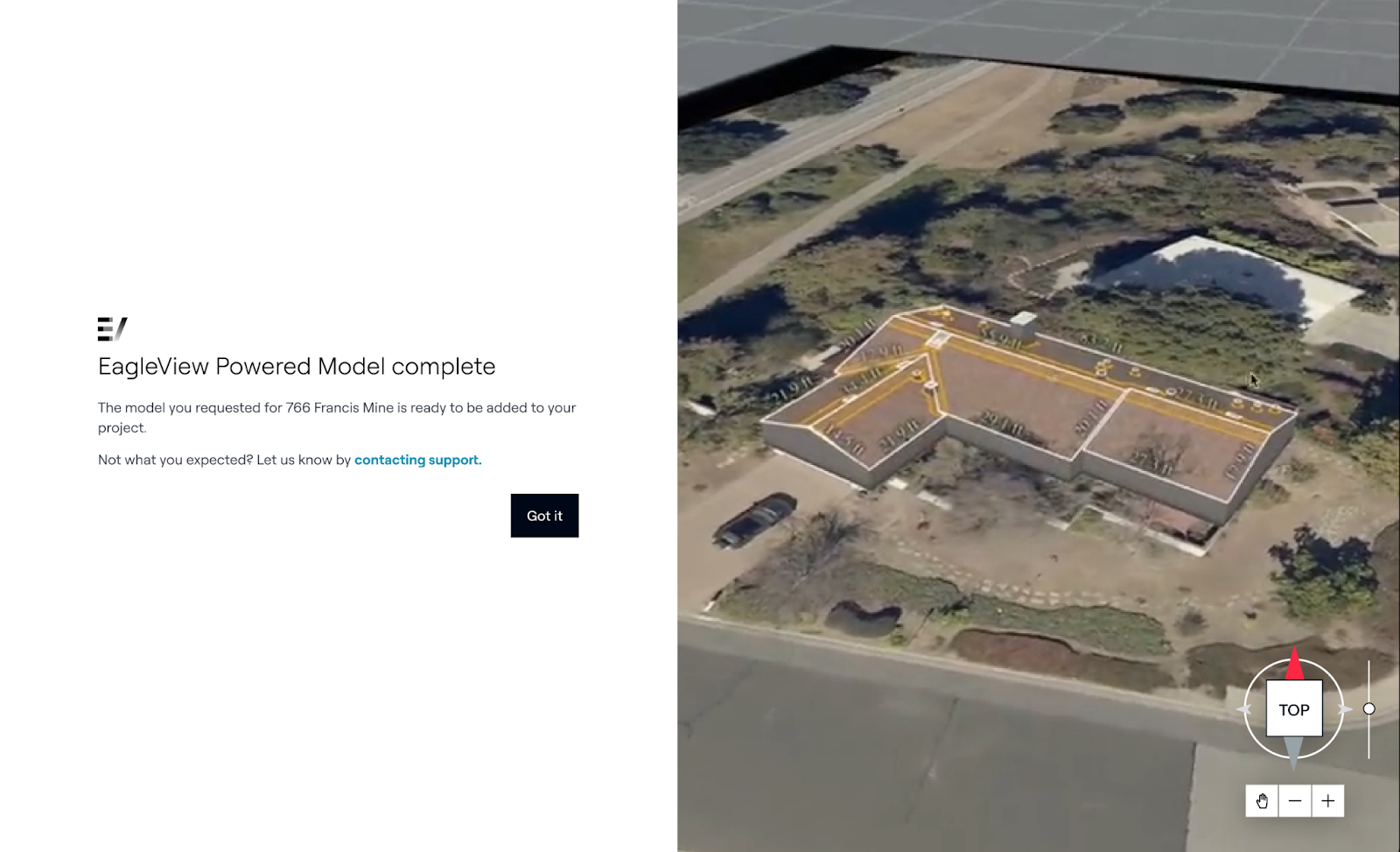 - Wählen Sie "EagleView Powered Model" und positionieren Sie den Stift über dem Haus, das Sie modellieren möchten.