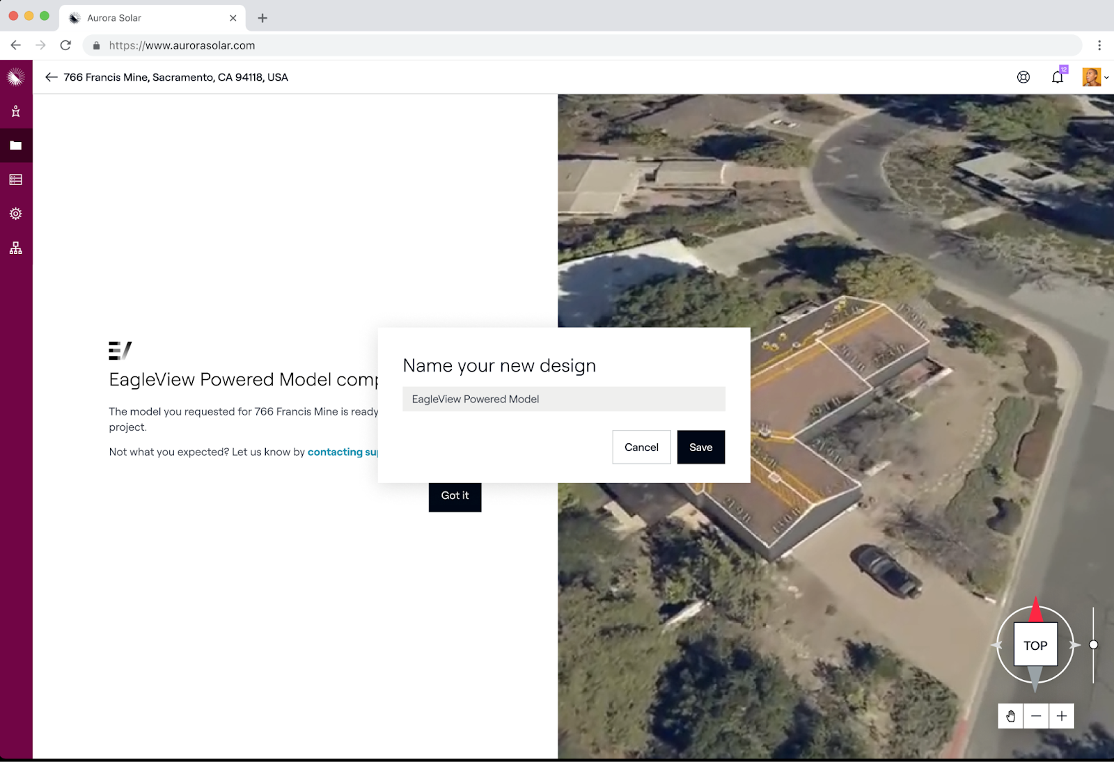 - Nennen Sie das neue Design. Dies ist der Titel des Entwurfs mit Ihrem EagleView Powered Model. Wir empfehlen Ihnen, EagleView in den Namen aufzunehmen. Klicken Sie auf 'Speichern'.