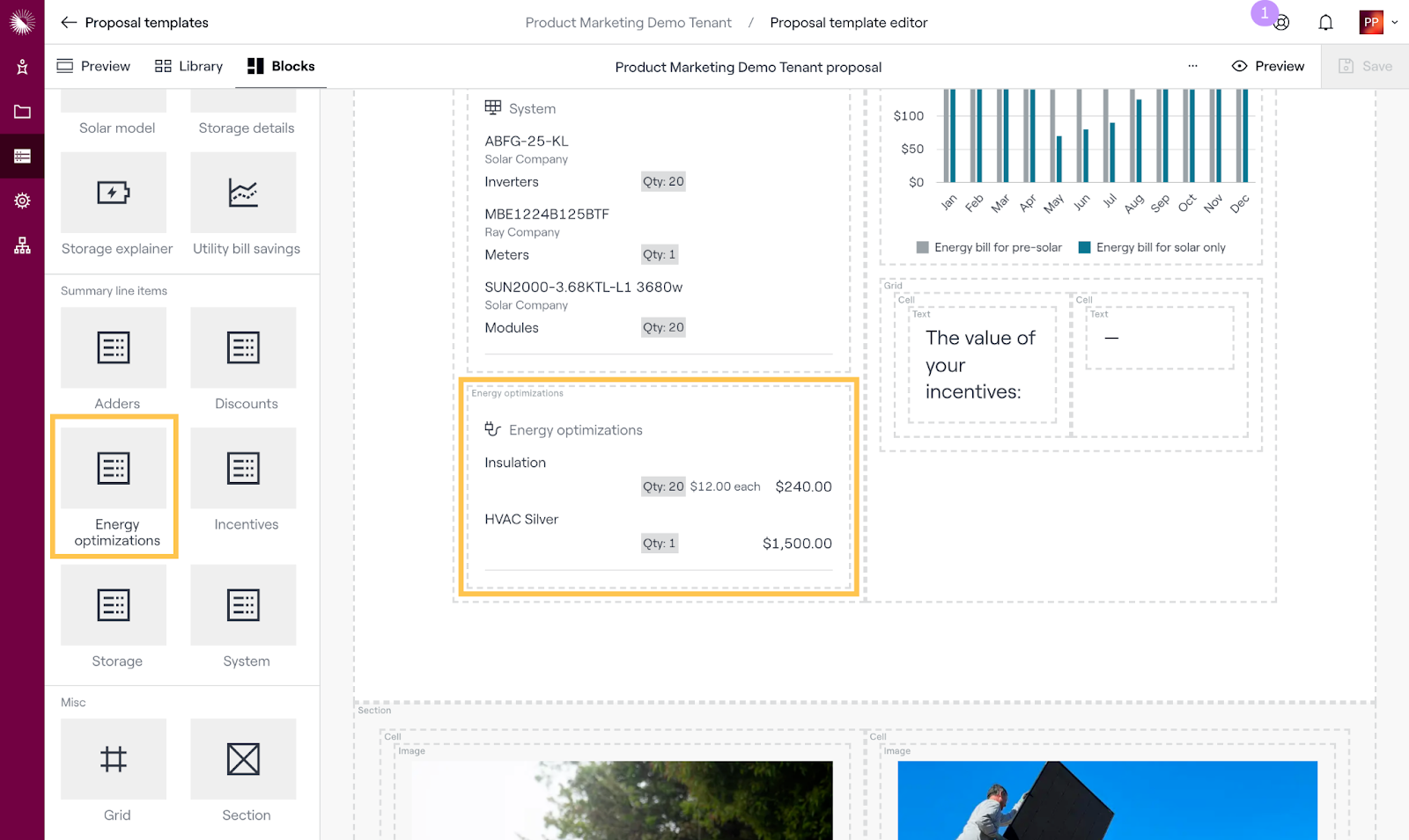 Um Energieoptimierungen einschließlich Name, Menge, Einzelperson und Gesamtkosten im Angebot anzeigen zu können, müssen Administratoren ihre Vorlage für den Verkaufsmodus so anpassen, dass der Block Energieoptimierung unter den Positionen der Zusammenfassung enthalten ist.