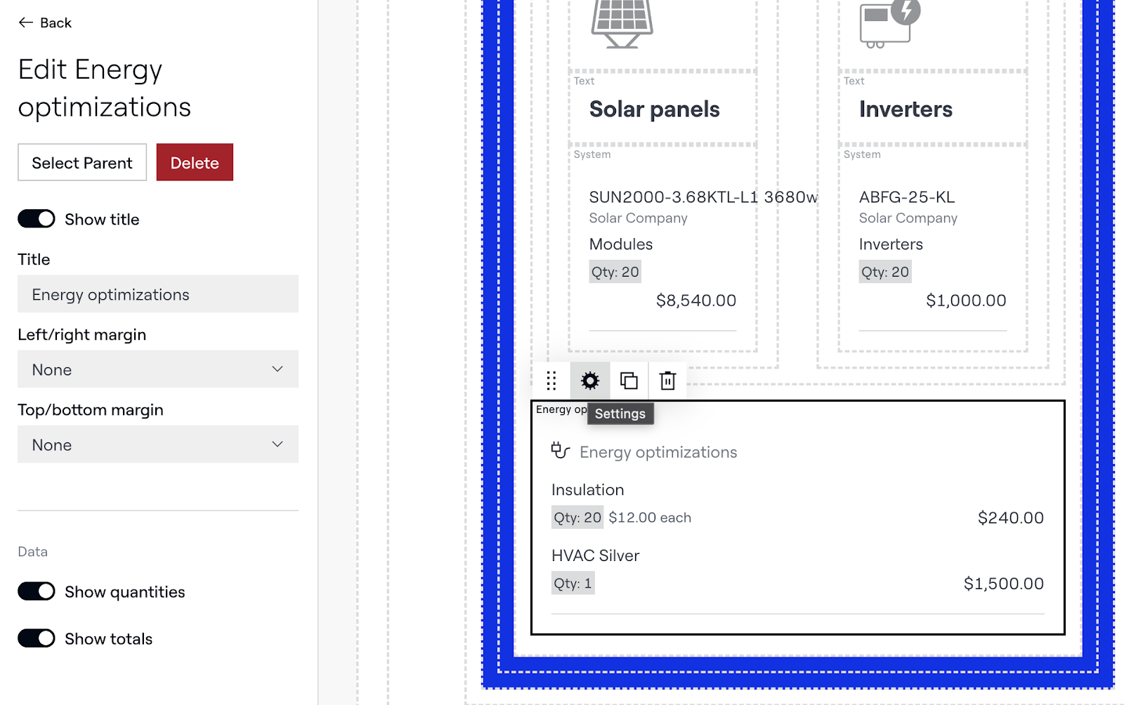 Der Energieoptimierungsblock verfügt über Konfigurationseinstellungen, mit denen ein Administrator die Anzeige von Mengen und Preissummen im Angebot sowie Standardeinstellungen wie Titel, Füllung und Rand steuern kann.