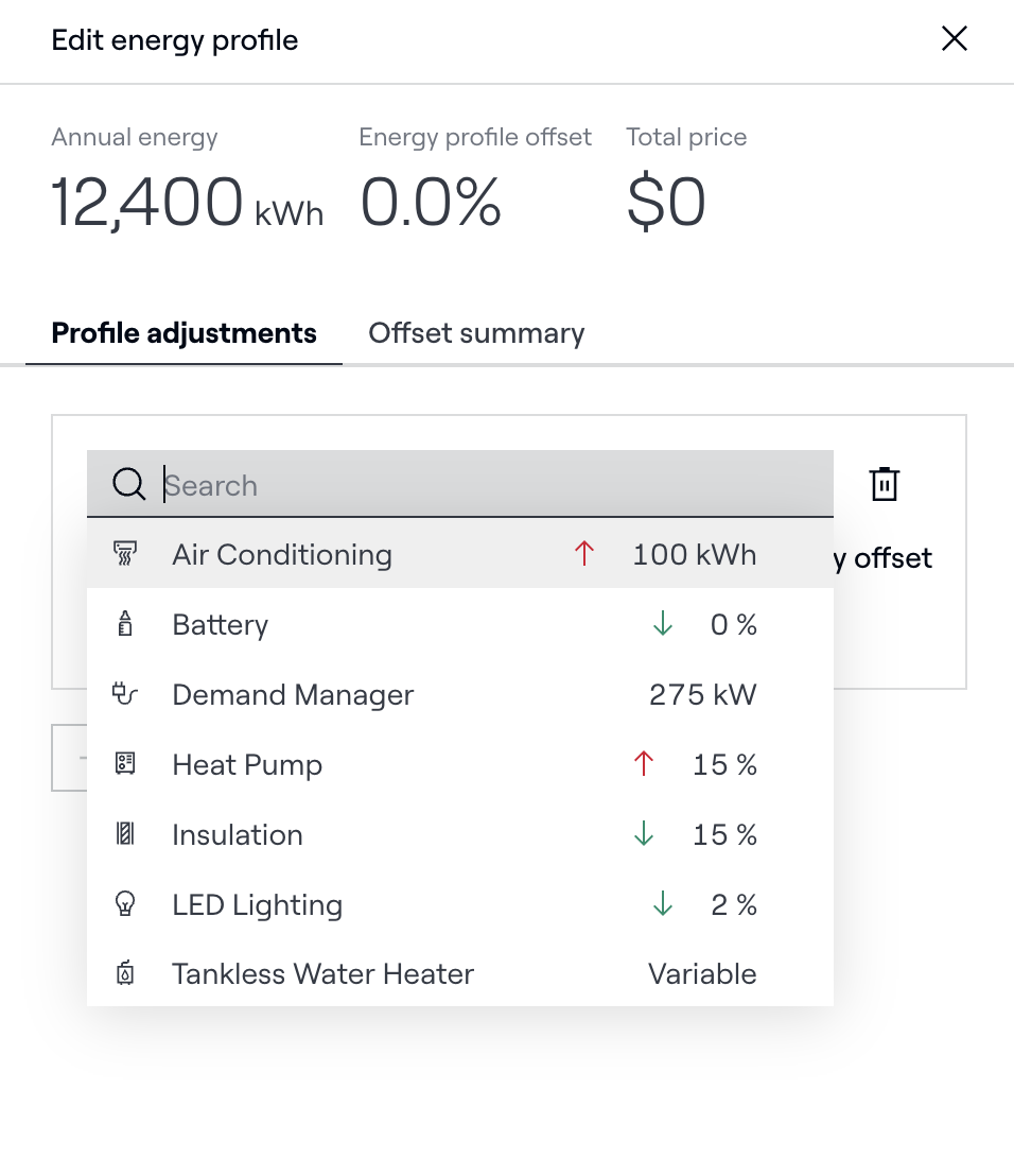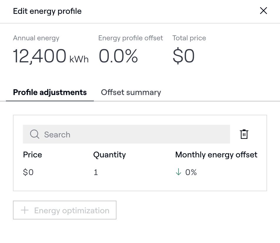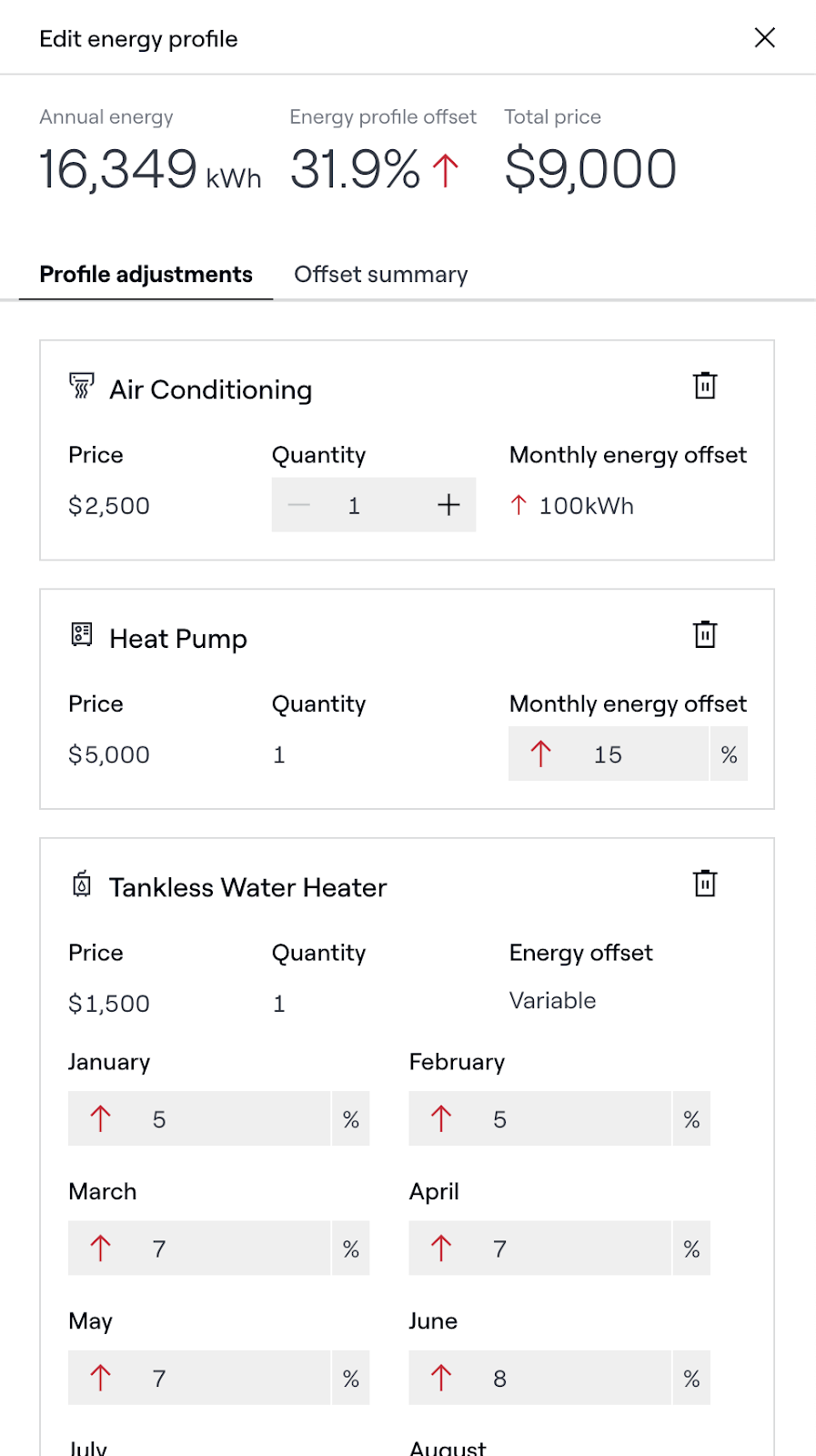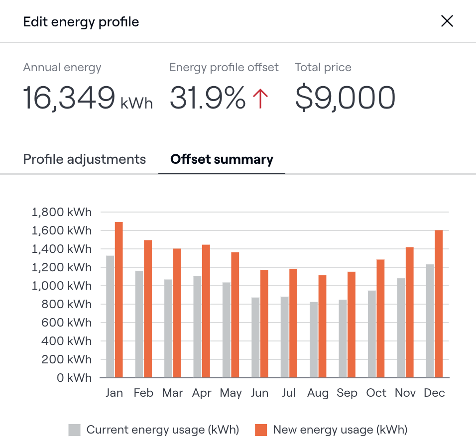 - Individuelles monatliches Energie-Offset ändern - Das Erhöhen oder Verringern dieses Wertes wirkt sich auf den zukünftigen Energieverbrauch um den eingestellten Betrag pro Monat aus und wird im Energieverbrauchsprofil angezeigt.