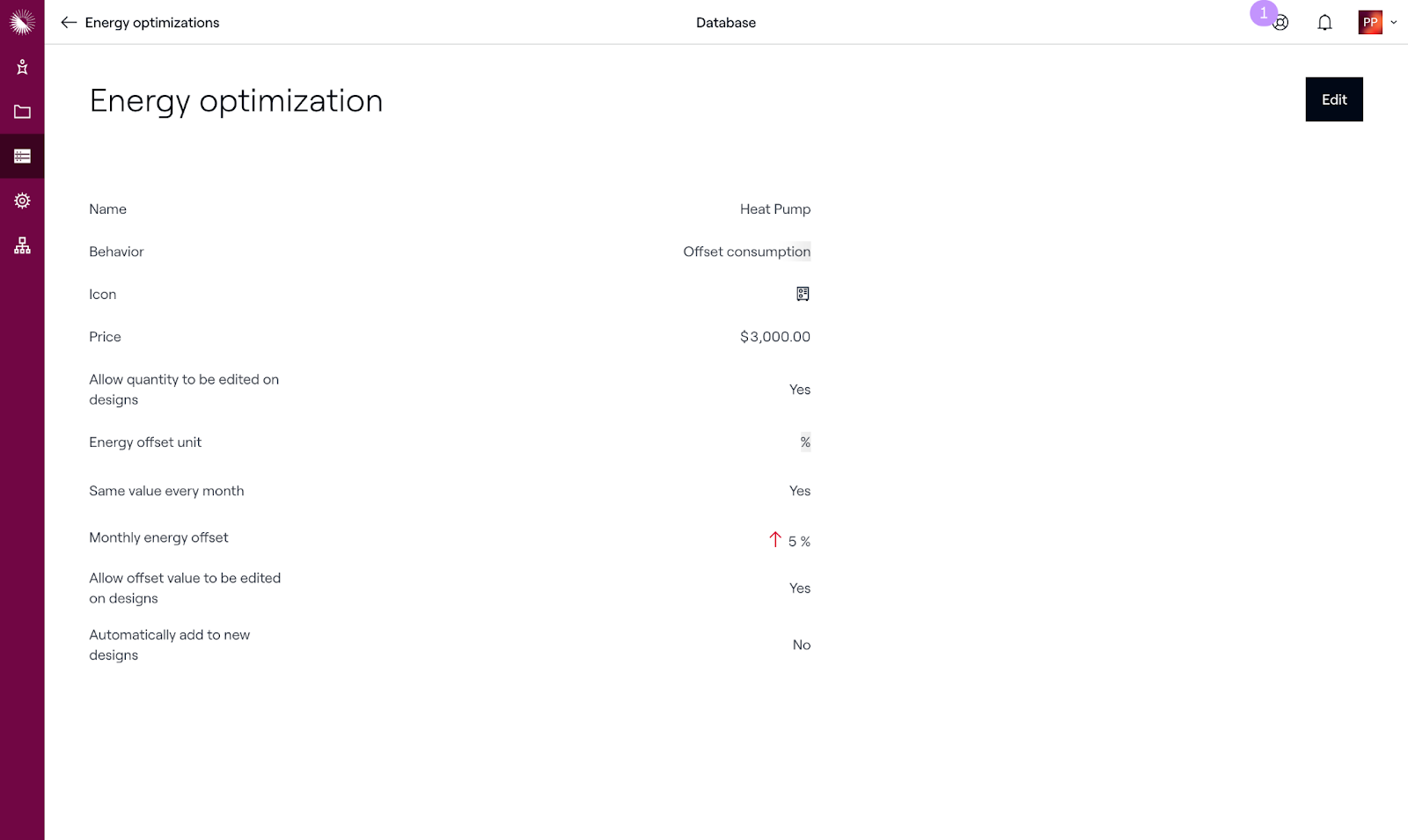 Energieoptimierungselemente müssen vom Kontoadministrator erstellt werden, damit sie auf einen Entwurf angewendet werden können. Navigieren Sie zu Datenbank > Energieoptimierungen, um loszulegen.