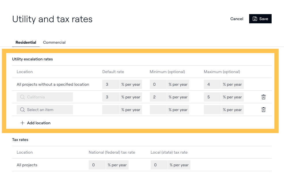 Aurora wendet die Standardzeile auf alle Projekte ohne angegebenen Standort an. Sie können standortspezifische Zeilen hinzufügen, um unterschiedliche Raten für bestimmte Bundesstaaten oder Regionen festzulegen – zum Beispiel, wenn die Strompreise in Kalifornien anders steigen als Ihr nationaler Standardwert.