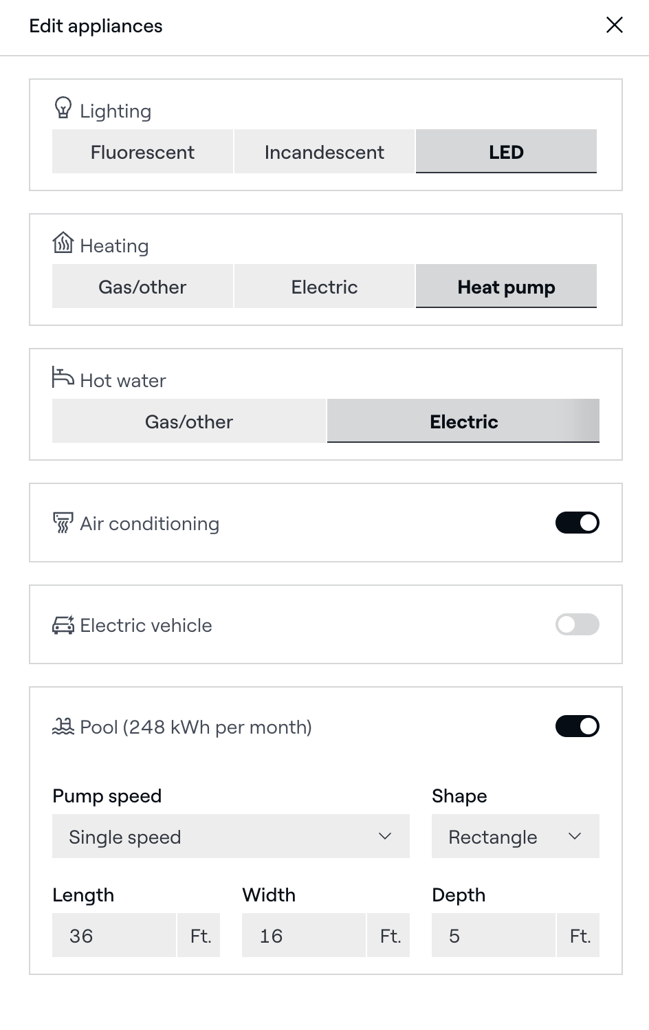 Sobald Sie den Pool hinzugefügt haben, zeigt Aurora eine Standard-Energieschätzung an. Klicken Sie auf das Bleistiftsymbol, um Anpassungen vorzunehmen: