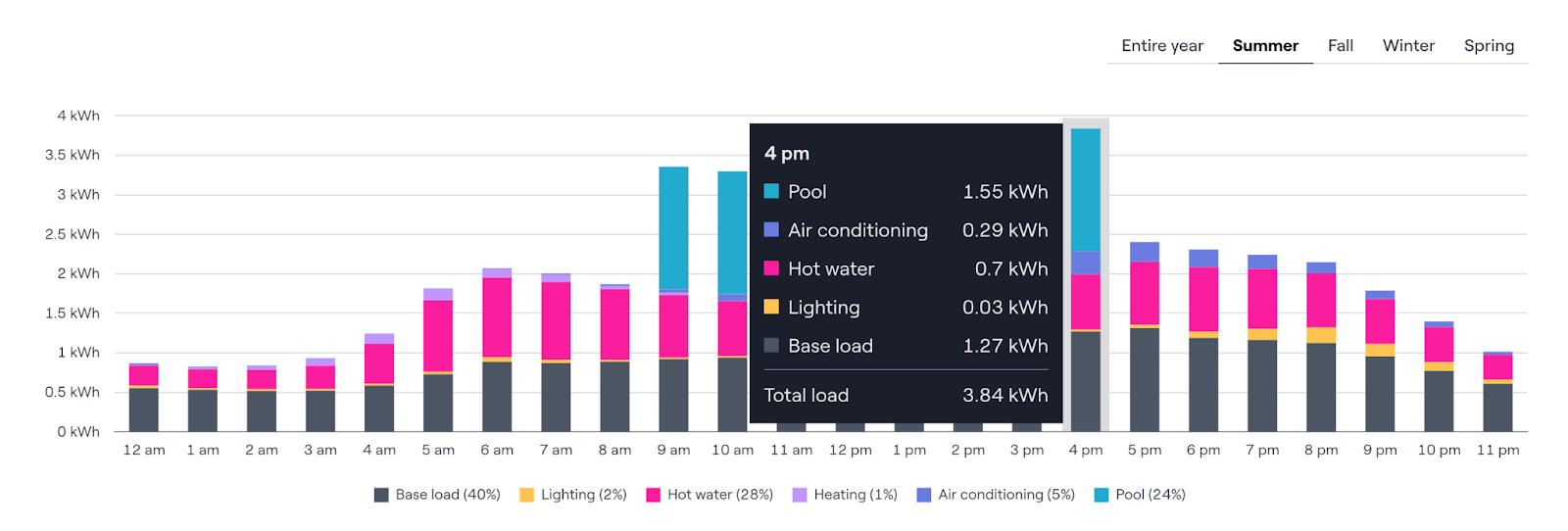 Sie können mit dem Mauszeiger über jede Stunde fahren, um die Auslastung zu sehen, und zwischen den einzelnen Jahreszeiten umschalten. Die Legende am unteren Rand des Diagramms schlüsselt den Prozentsatz für jede Last während des Tages auf.
