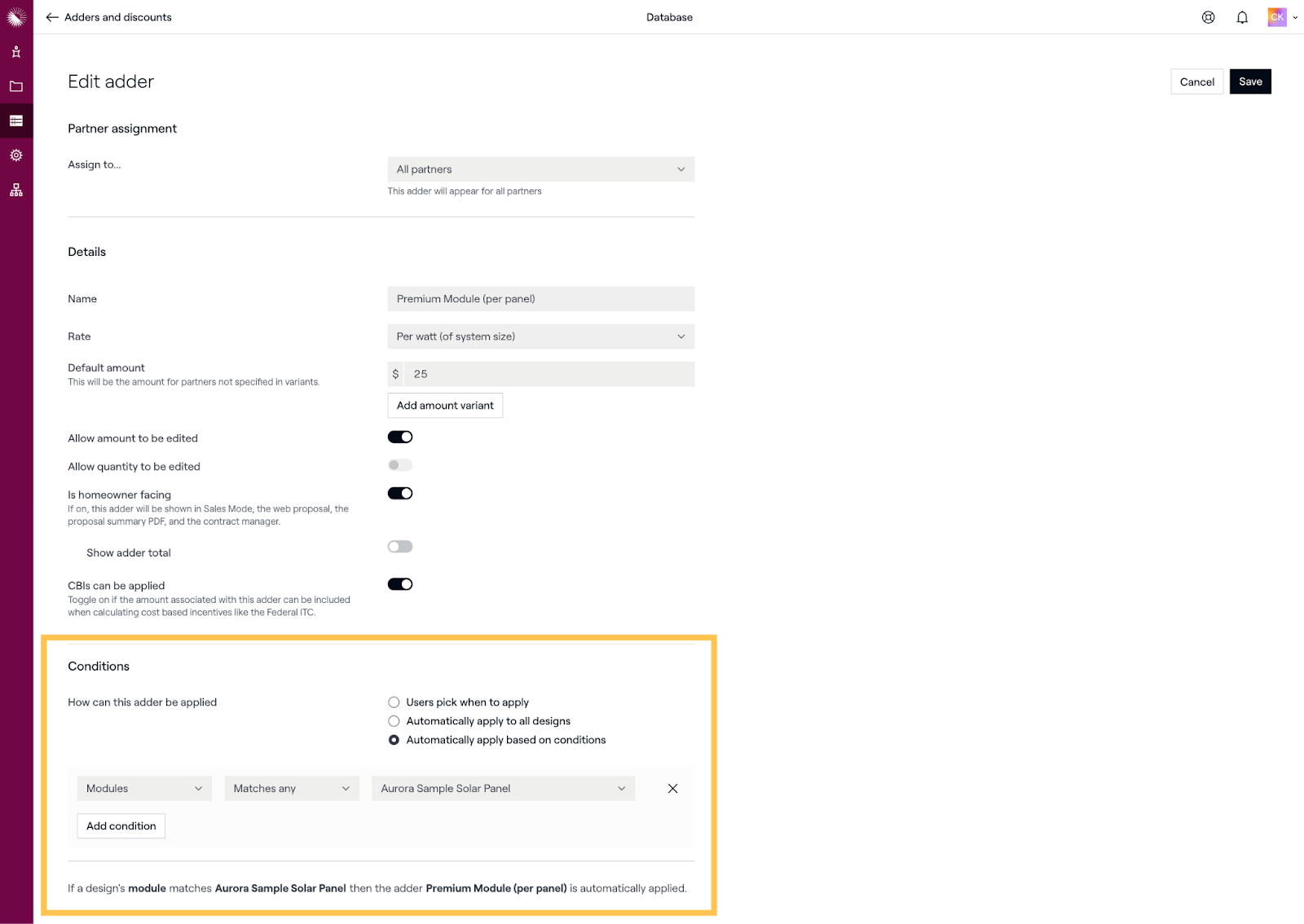 Für Hausbesitzer sichtbar — Wenn aktiviert, ist der Name des Aufschlags im Verkaufsmodus, im Web-Angebot, im Angebotszusammenfassungs-PDF, im Vertragsmanager und über die Preisübersicht sichtbar. Wenn deaktiviert, beeinflusst der Aufschlag weiterhin die Preisgestaltung und erscheint auf der Preisübersichtsseite und über die API, ist jedoch für hausbesitzerbezogene Oberflächen verborgen.