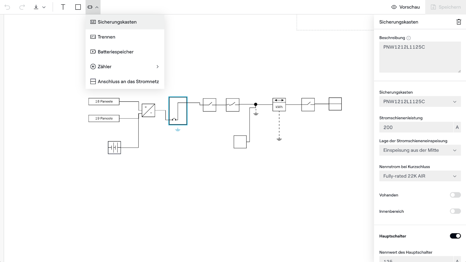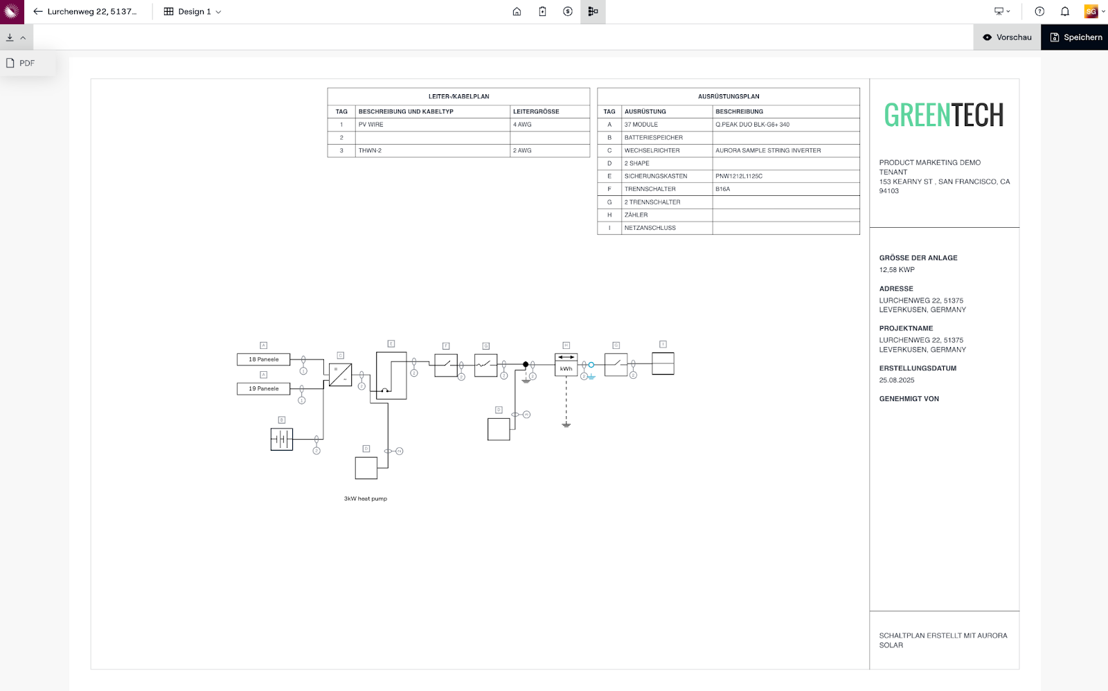 Dadurch wird automatisch ein Schaltplan generiert, der die Module, Wechselrichter und andere Komponenten enthält, die auf der Seite „Anlagendesign“ hinzugefügt wurden.