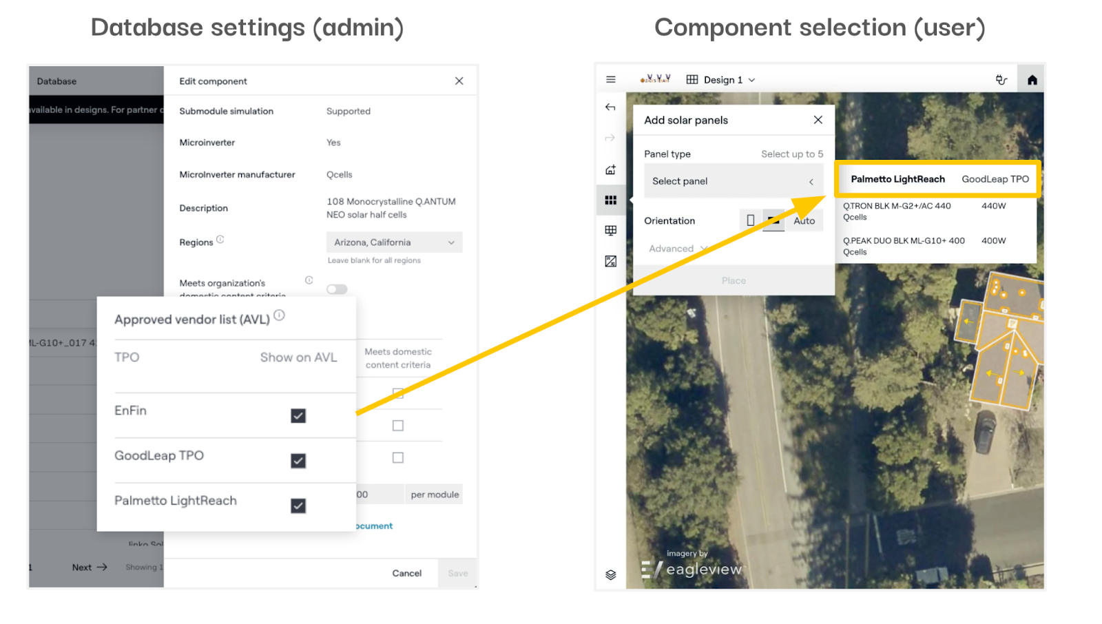 Mit den Sichtbarkeitseinstellungen für Komponenten können Administratoren steuern, welche Solarkomponenten ihren Teams je nach Standort, Anforderungen des Finanzierers und Vorgaben zum inländischen Inhalt zur Verfügung stehen. Diese Einstellungen helfen sicherzustellen, dass Vertriebsmitarbeiter und Designer nur die für ein bestimmtes Projekt geeigneten Komponenten sehen, um Risiken zu reduzieren, Finanzierungsprobleme zu vermeiden und das Benutzervertrauen bei der Planung und Angebotserstellung zu erhöhen.