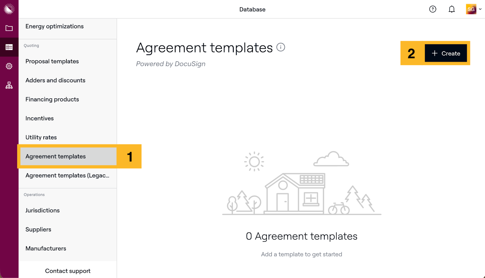- Navigieren Sie zu Datenbank > Vertragvorlagen. Klicken Sie dann auf + Erstellen