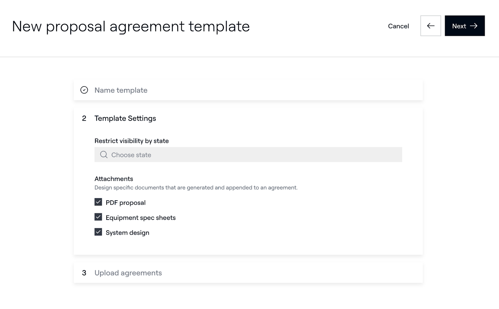- Sichtbarkeit nach Bundesland einschränken – wählen Sie die Bundesländer aus, in denen diese Vorlage verfügbar sein soll. Benutzer können diese Vorlage nur sehen, wenn sich die Projektadresse in einem der ausgewählten Bundesländer befindet. Wenn keine Bundesländer ausgewählt sind, steht die Vorlage für alle Projekte zur Verfügung.