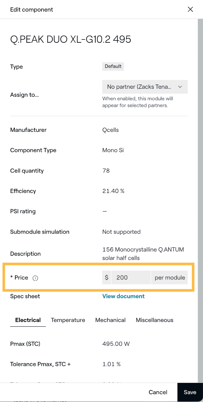 Nach dem Speichern wird die Kostenangabe dieses Modells bei der Verwendung in einem Design auf den Seiten Preisgestaltung und Finanzierung sowie in der Systemübersicht im Verkaufsmodus angezeigt.