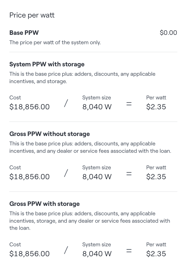 - Preis pro Watt (PPW) — eine Kombination aus Basis-PPW und Systemgröße