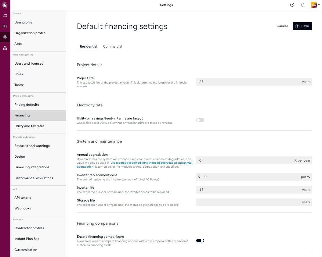 Finanzierungsstandards legen die Modellannahmen fest, die Aurora für finanzielle Analyseberechnungen verwendet — Kapitalwert (NPV), Stromgestehungskosten (LCOE), Amortisationszeitraum und mehr. Diese Einstellungen gelten kontoweite und sind in zwei Registerkarten unterteilt: Wohngebäude und Gewerbe.