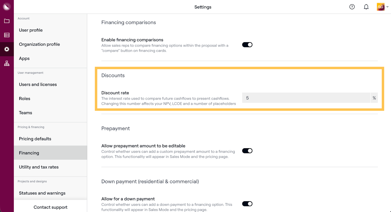 Your account admin sets an organization-wide default discount rate in Settings. Individual users can also override it on a per-project basis in Sales Mode, if they have permission to do so. The value affects key financial outputs, including net present value (NPV), LCOE, and the lifetime savings your customer sees on their proposal.