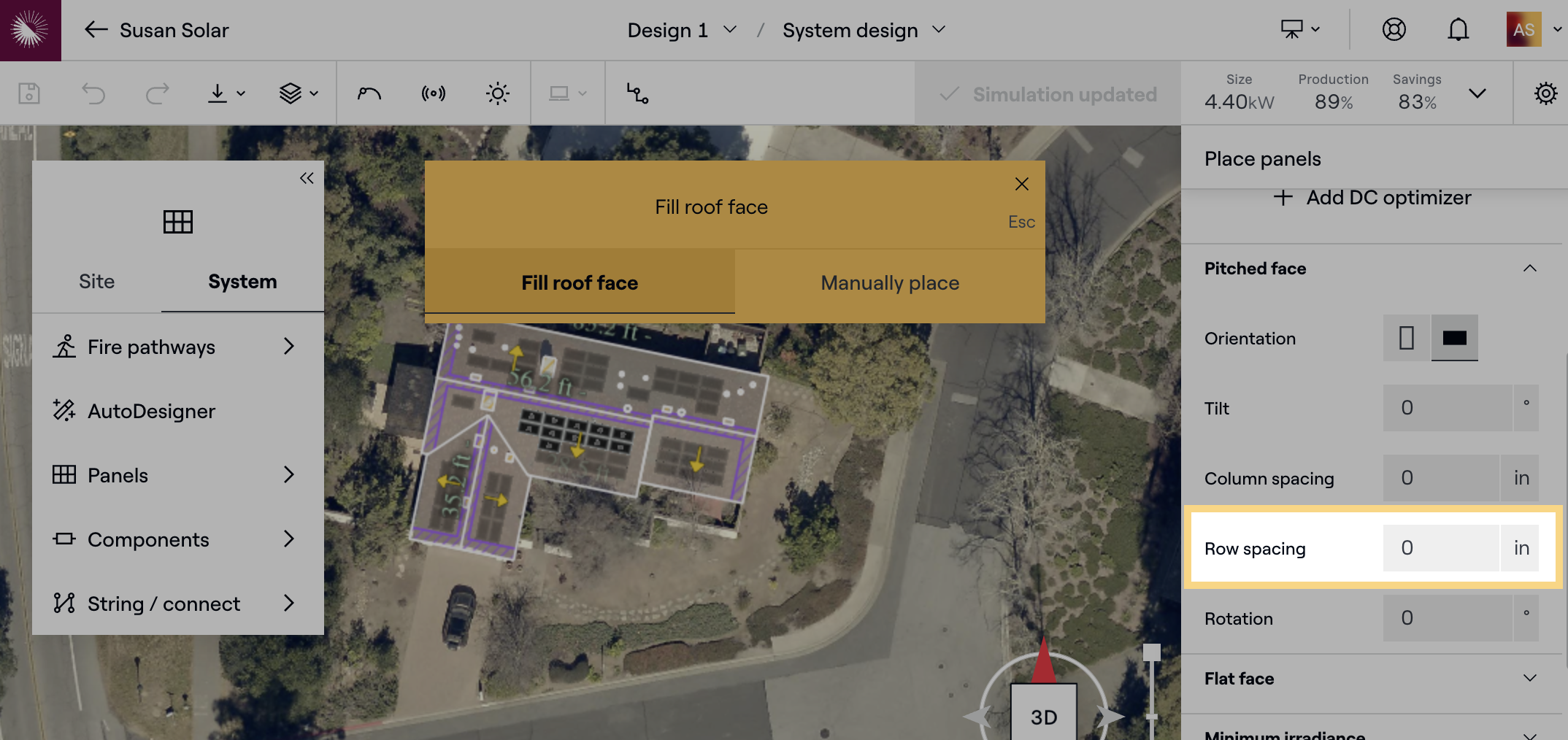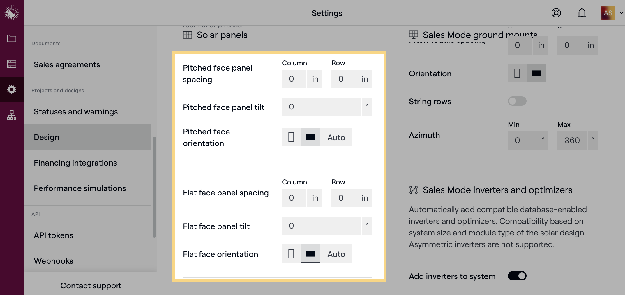 - Scroll down to input values for default module spacing for both pitched and flat roofs.