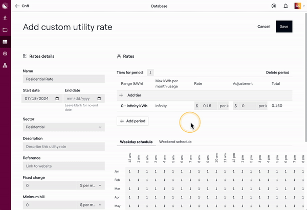 - Input a Name, Sector (Residential or Commercial), Description, Reference, Effective period, Fixed monthly charge, and Energy usage unit.