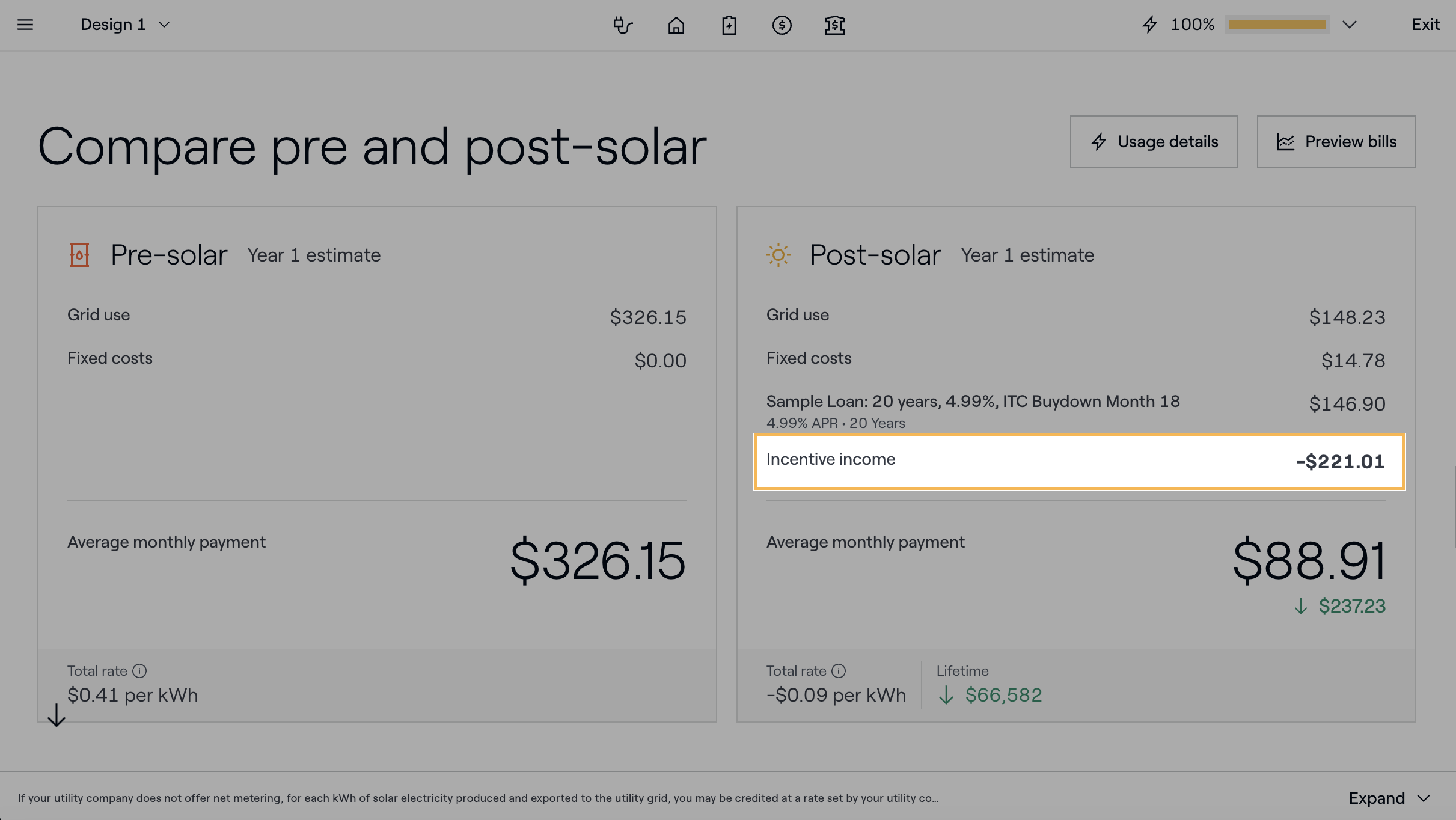 Once enabled, there will be a new item in the post-solar card in Sales Mode for “Incentive income”. This will factor the expected monthly income from SRECs into their post-solar bill and the monthly savings chart.