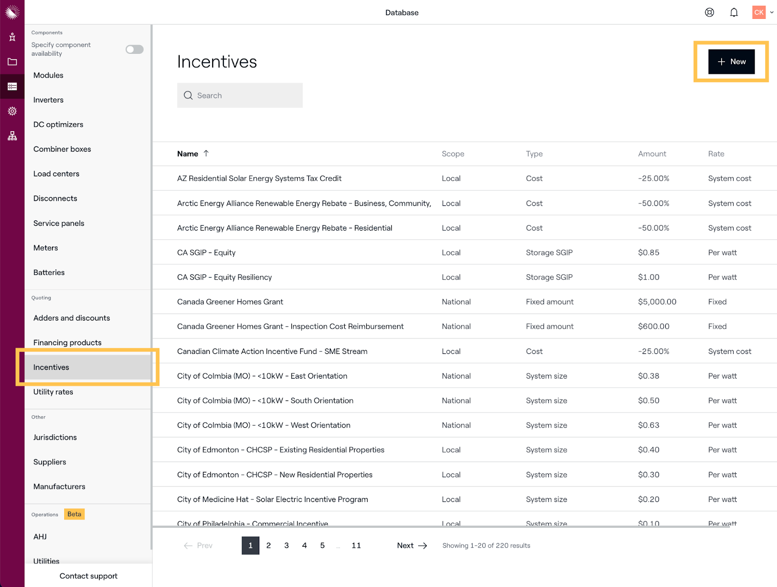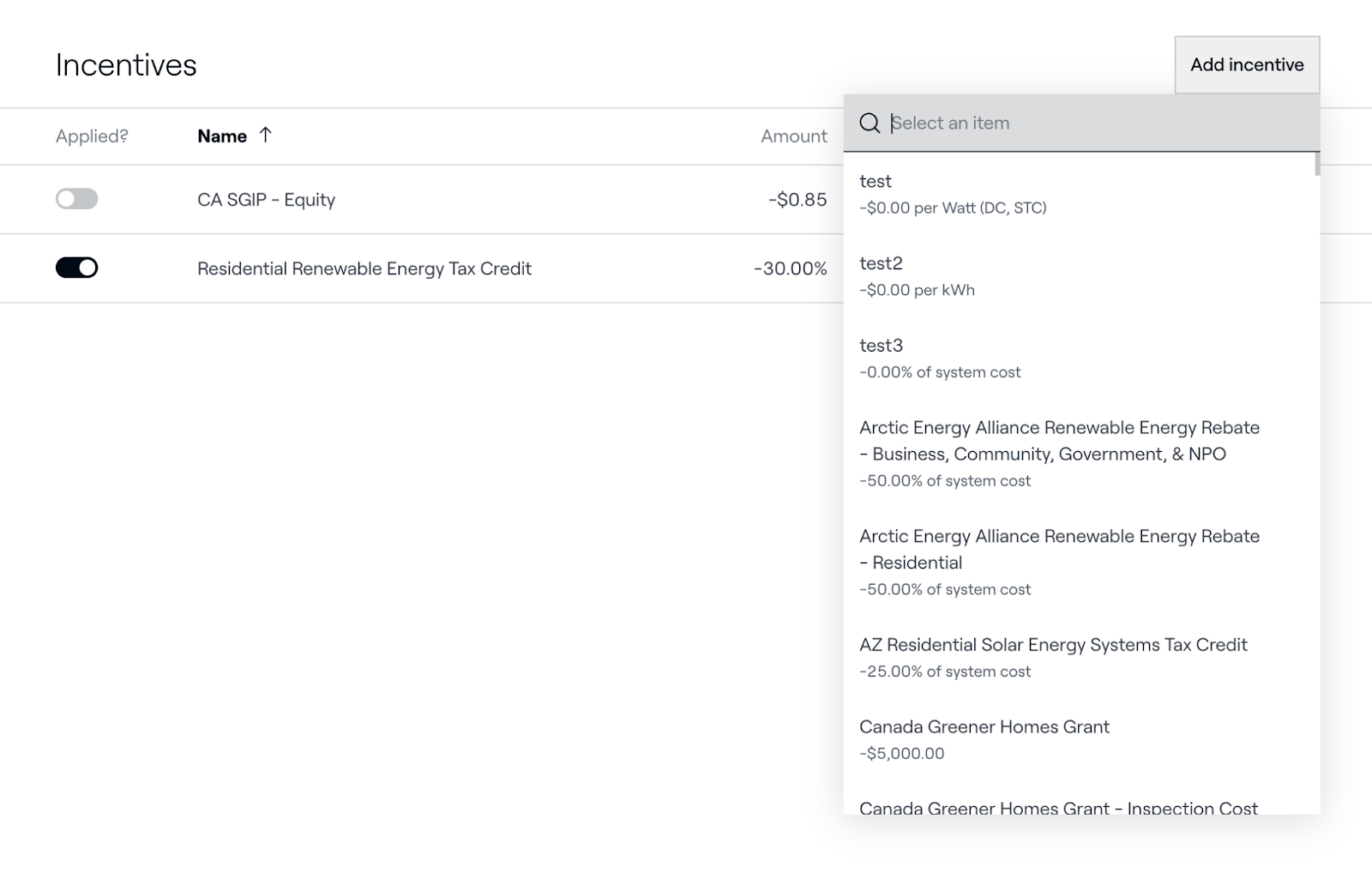 Some SREC programs, like other incentives, are already modeled for you in Aurora’s Database section. To apply these to your project in Sales Mode, navigate to the Pricing page > Incentives > then search for the incentive you’d like to apply.