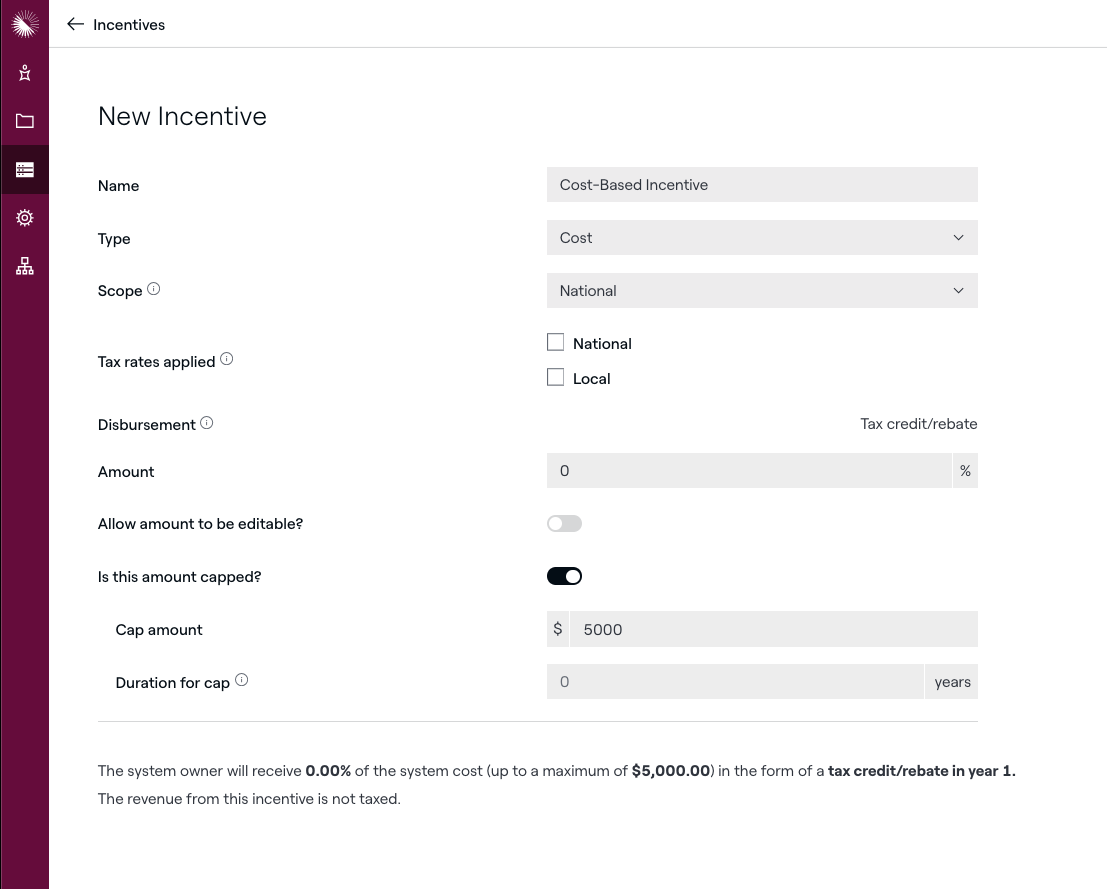- Amount: The percentage of the system cost that is offset by this incentive.