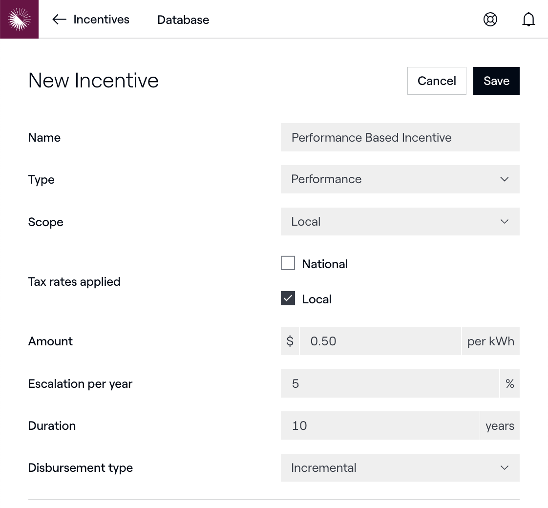- Disbursement: Fields in this section will update dynamically based on the Type selected; fields may include a tax rebate %, system size & amount per watt, performance, and others.