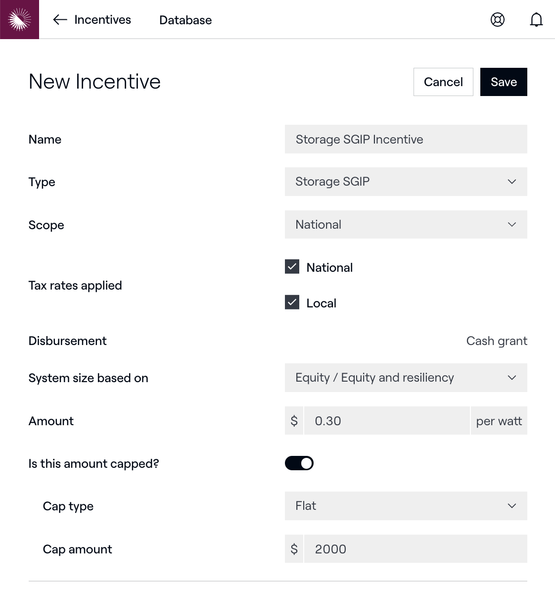 - Disbursement: This is set as Cash Grant and cannot be changed. All system sized incentives are issued as grants, which the customer may receive up-front or in a future year.