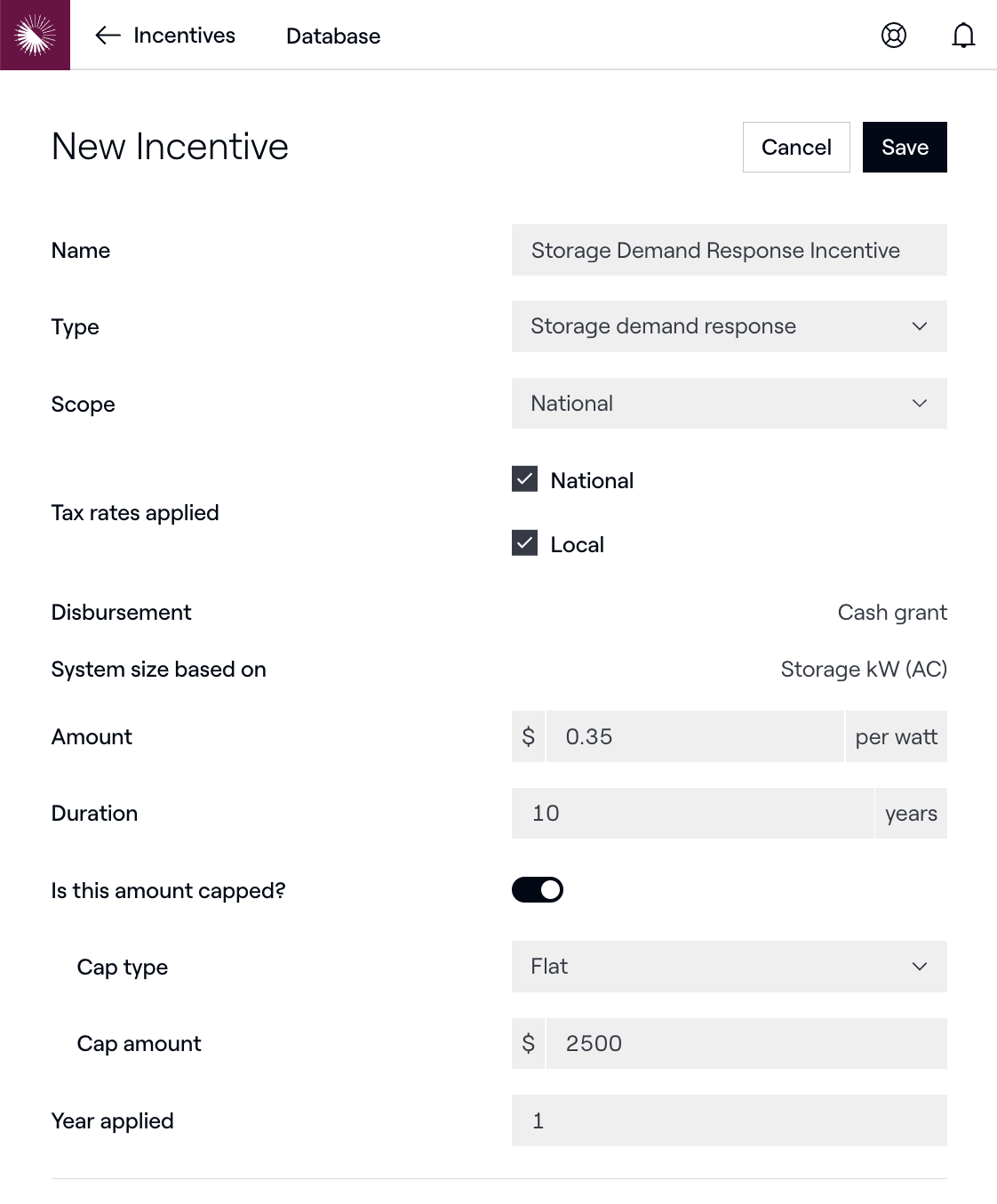 - Year Applied: The year that this incentive will be applied. Entering Year 0 will reduce the system cost immediately.