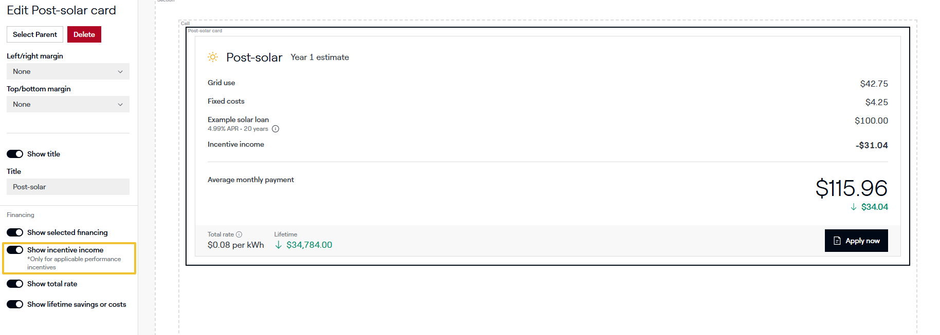 To show the effect of SRECs on the homeowners’ post-solar monthly bill, admins will need to navigate to Database > Proposal Templates > Select a template in which this value will show > Add Post Solar Card Interactive > Enable "Show Incentive Income"