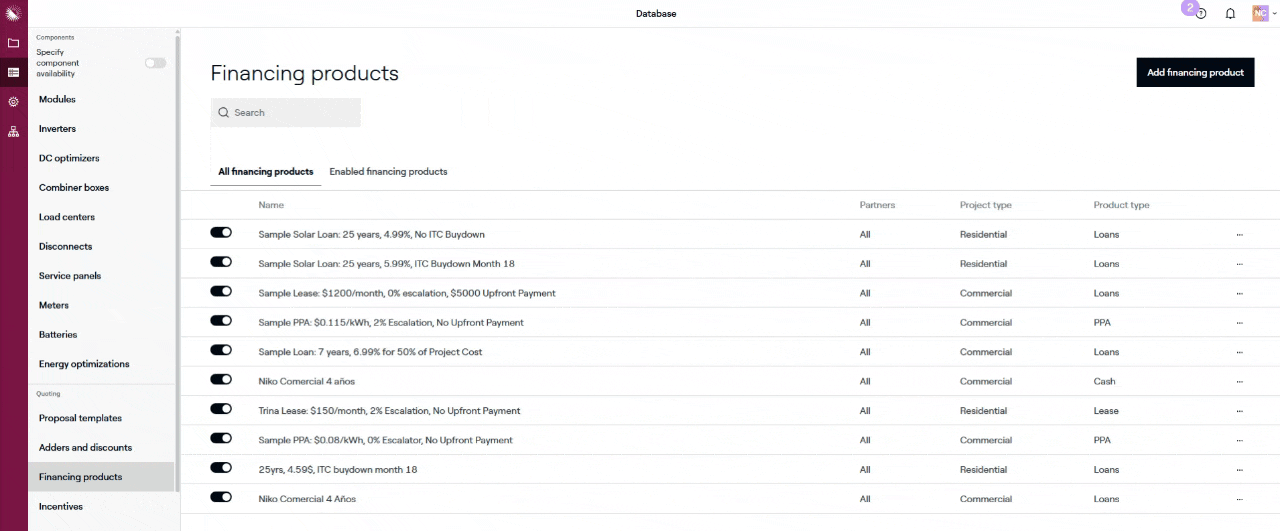 First open the Database from the left-hand navigation bar, then click Financing products.