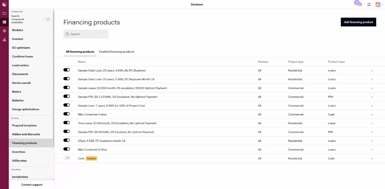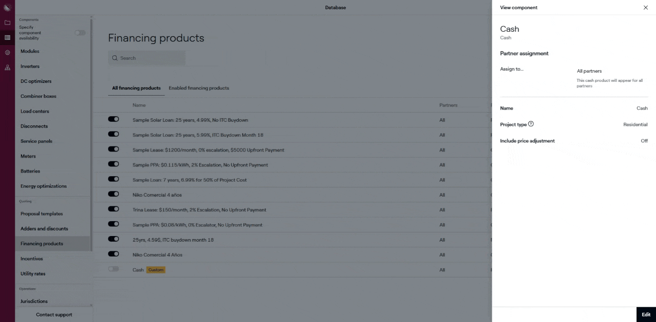 Click ‘Add financing product’ in the upper-right and use the modal that appears to give the product a name, select a Project type (Residential or Commercial), and then select ‘Cash’ as the Financing type. Click ‘Add’.