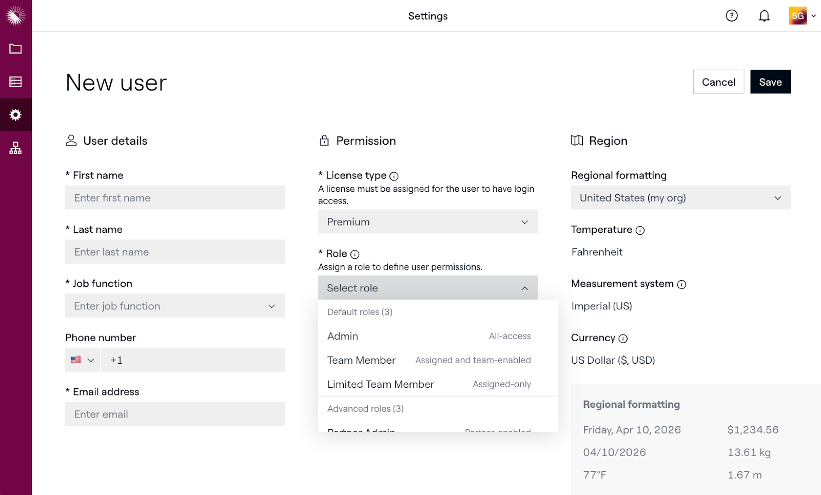 Role — Controls what a user can do within your organization's account. Available roles are: