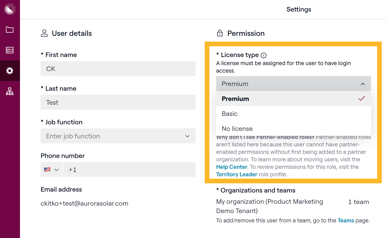 - Choose a License Type (Premium or Basic) and a Role (Admin, Team Member, or Limited Team Member)