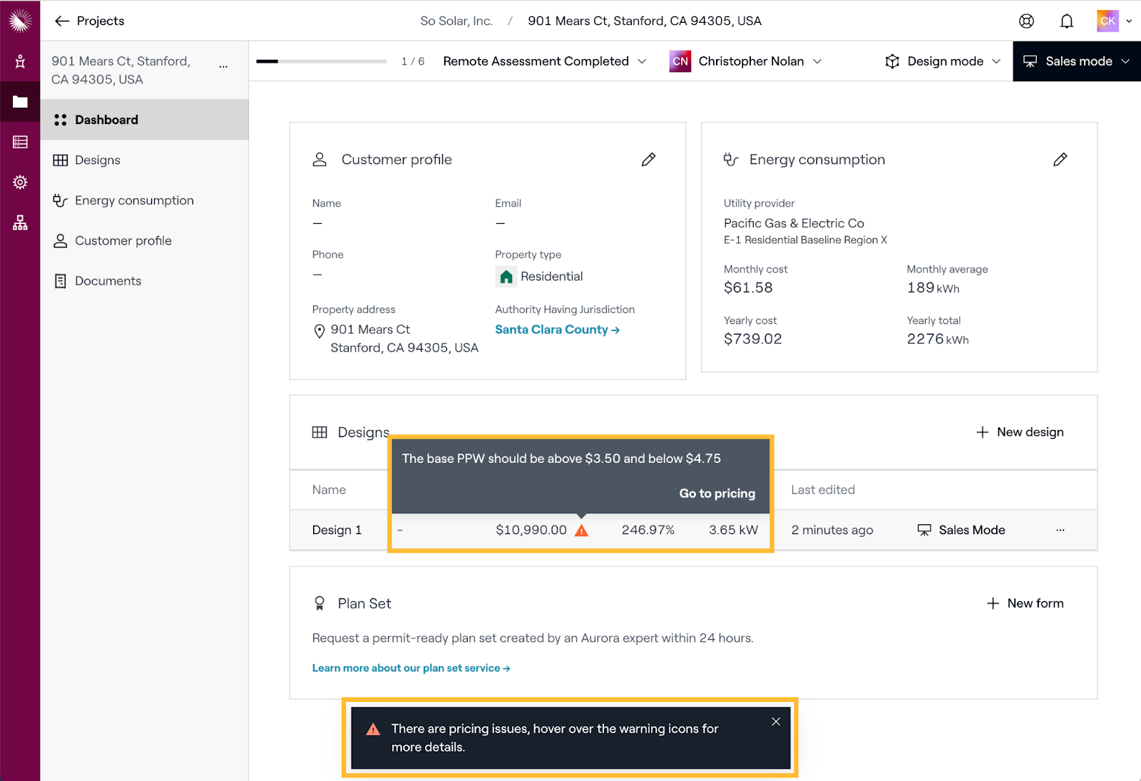 If the current Base price per watt for a Project is not within the allowable range for the user assigned to that Project, an error warning will appear on the Project Overview page. Hover your mouse over the message to view a brief message with details and a link to that design’s Pricing page.