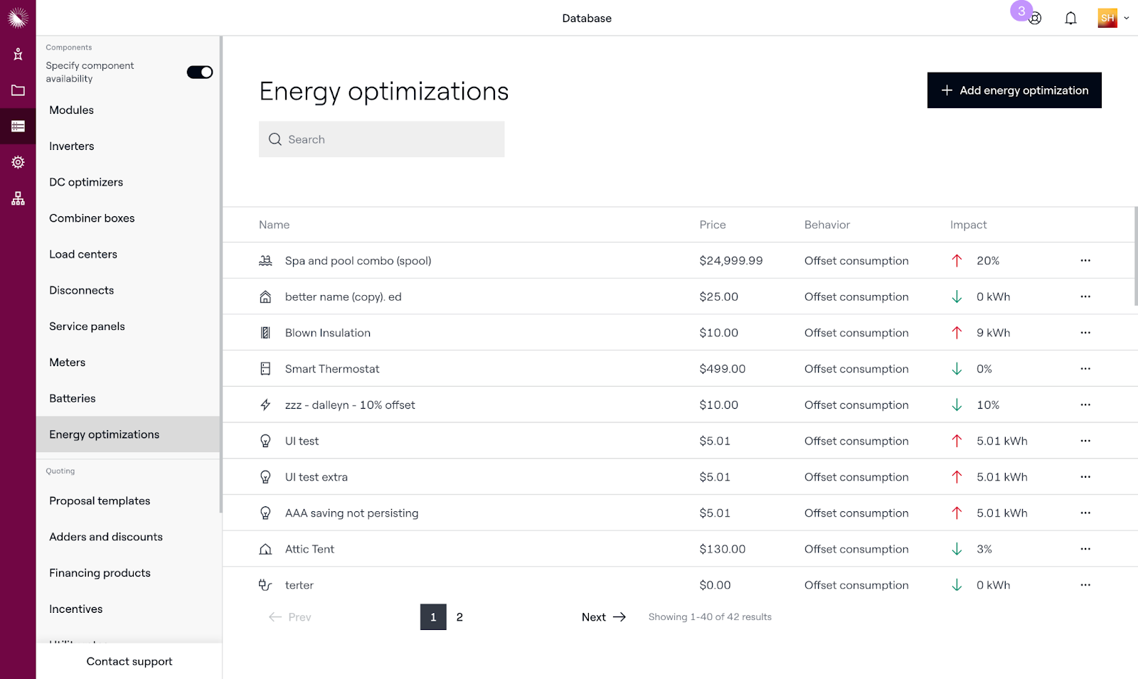 A new Energy Optimizations page under the database will allow admins to add any appliance, energy efficiency solution, or other product that will impact a homeowner’s future consumption needs. This new feature will allow your teams to build whole home proposals by incorporating electrification and/or efficiency add-ons into proposals.