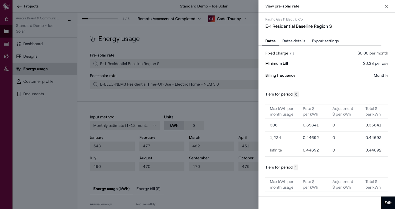 For individual projects in Aurora, users will be able to view and edit pre- and post-solar rate details on the Energy Usage page in Sales Mode and the Project Dashboard.