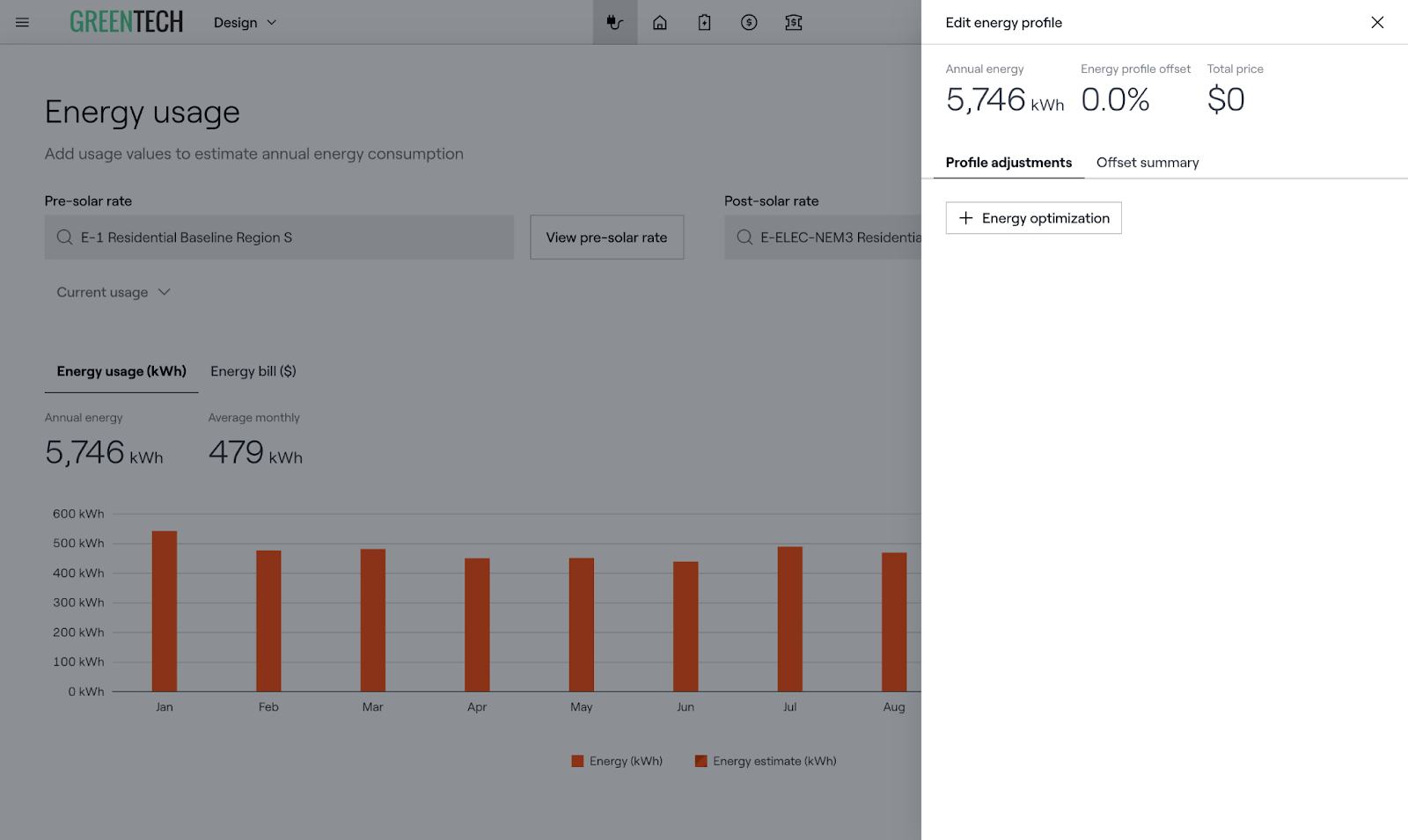 - Offset Summary shows a bar chart graph of current and new energy usage based on applied Energy Optimization items