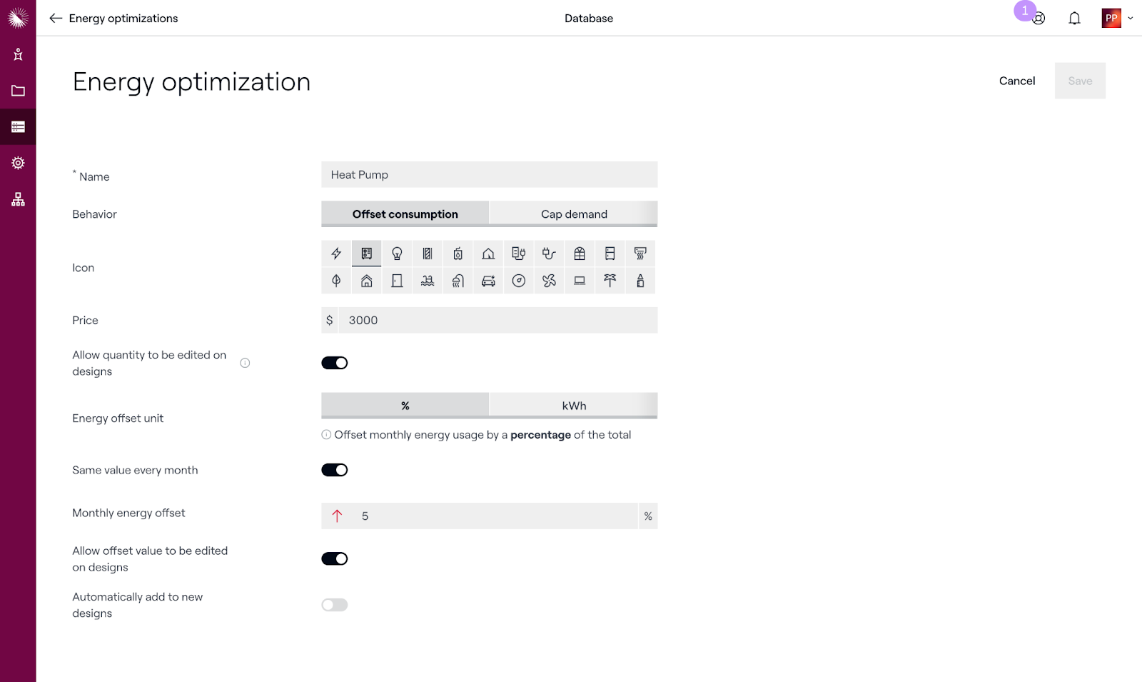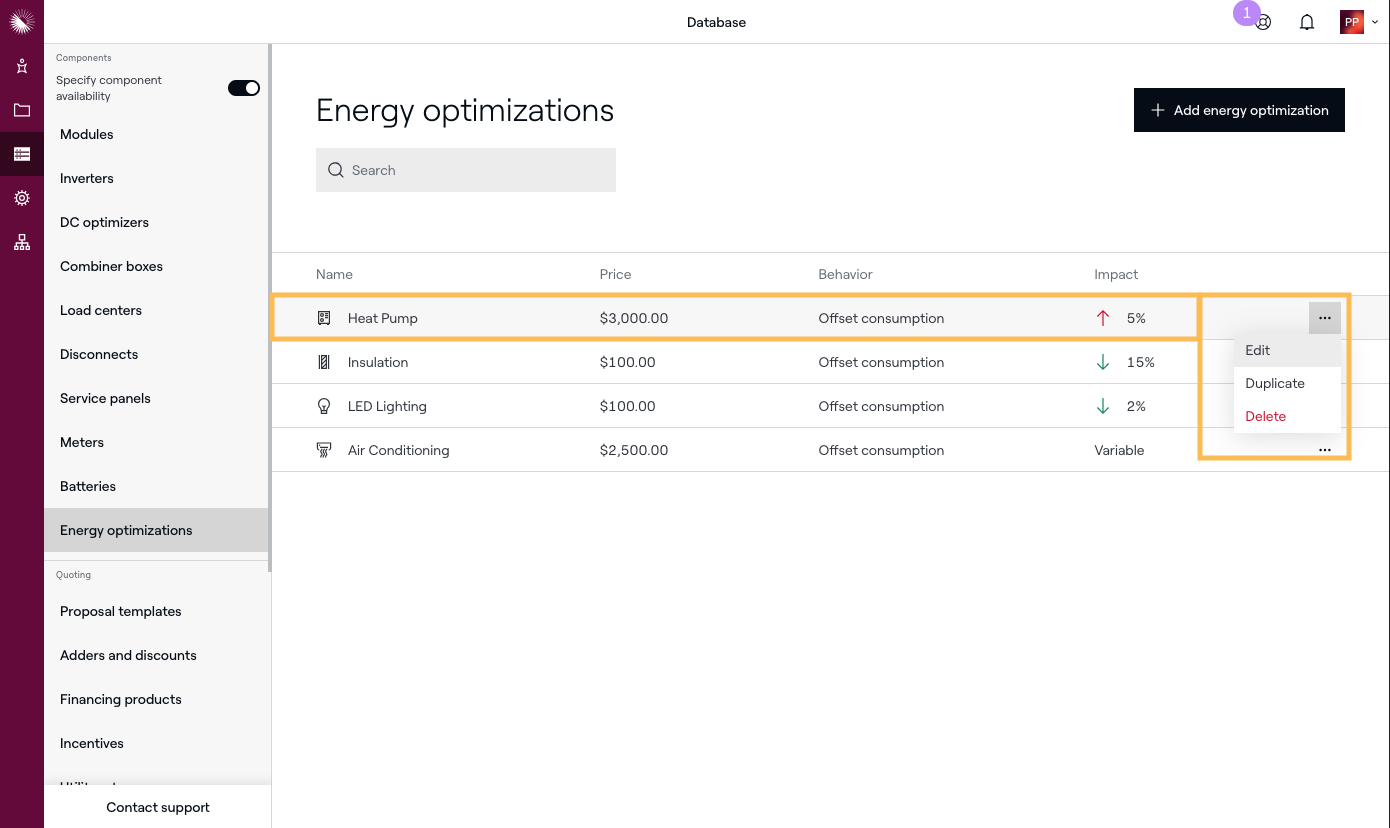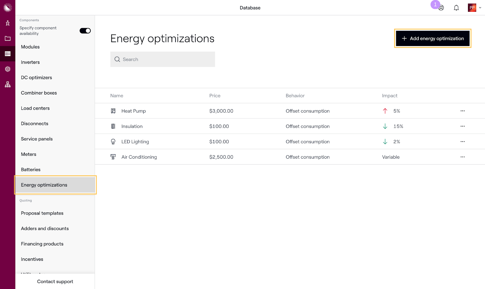 Energy optimization items will need to be created by the account admin in order for them to be applied to a design. Navigate to Database > Energy Optimizations to get started.