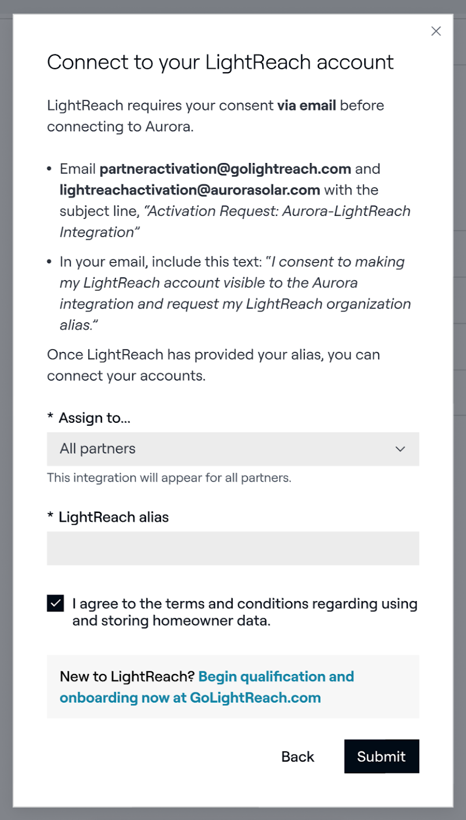 - Send an email to both partneractivation@golightreach.com and lightreachactivation@aurorasolar.com with the subject line “Activation Request: Aurora-LightReach Integration” or similar