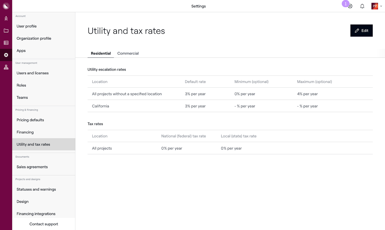 To pitch LightReach products, users must not set an escalation rate higher than 4% for projects. In order to enforce this requirement, navigate to Settings > Utility and tax rates to configure your utility escalation rate maximum to 4%. This will impact all projects, or you can set the requirement to projects in specific states.