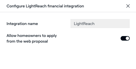 Navigate to Settings > Financing integrations and click +Add in the upper right. Select LightReach from the dropdown menu then enter your LightReach alias to activate the integration. (Your organization alias is found in the LightReach portal at Settings > Organization, and also in the portal’s URL.) Also in this modal: use the Assign to… dropdown menu to make this integration available for a Partner or Partners in your account, or for non-Partner users. Click here to learn more.