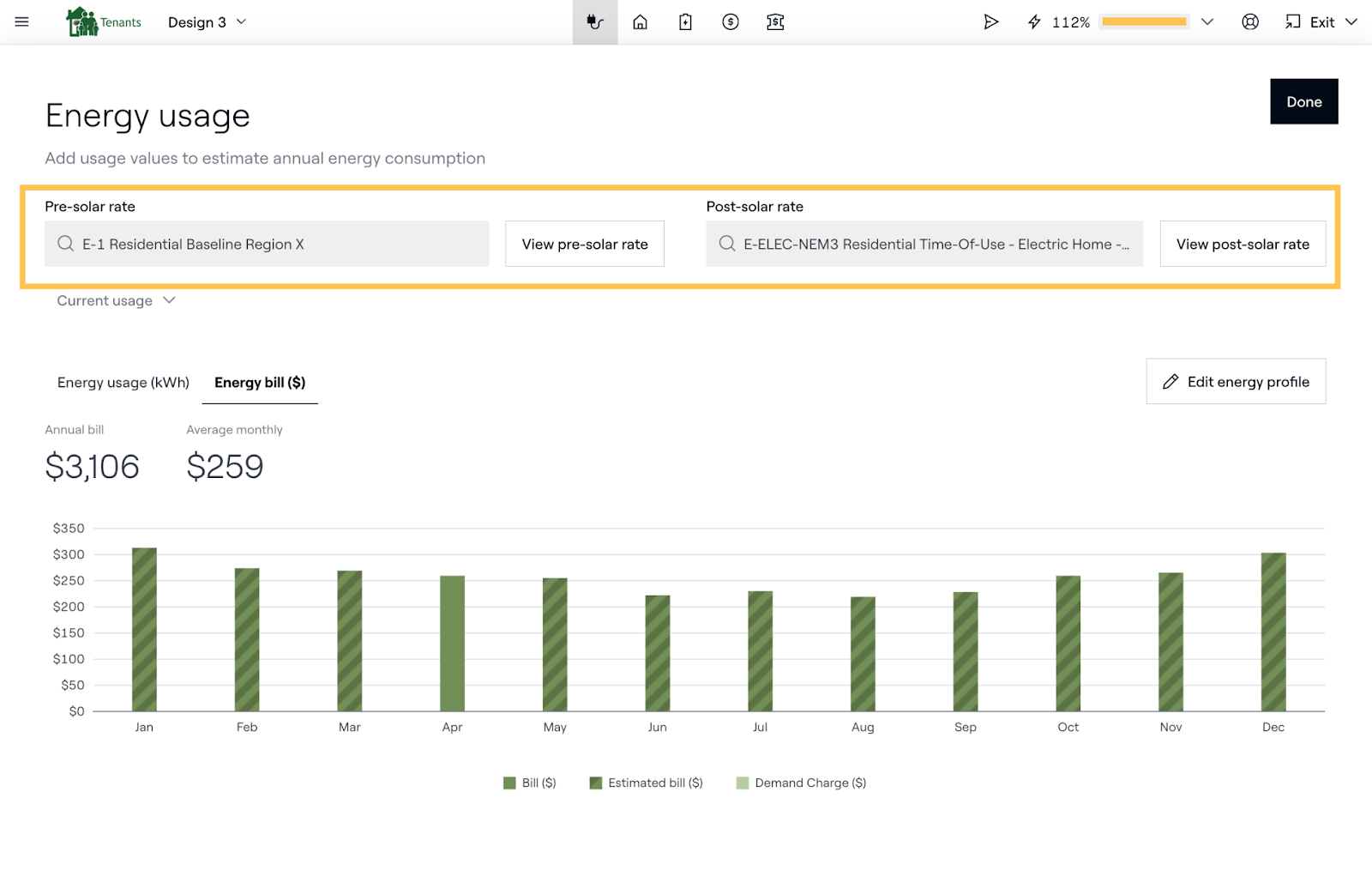 Because TPO product availability is dictated by the homeowner’s utility provider, Sales Mode users should first check the Energy usage tab to ensure the Pre-solar rate utility provider is covered by EnFin. Additionally, the homeowner’s current usage must be added for each month (with 1+ months of usage provided by the user, Aurora will automatically estimate the full year’s usage) in order to retrieve pricing options from EnFin.