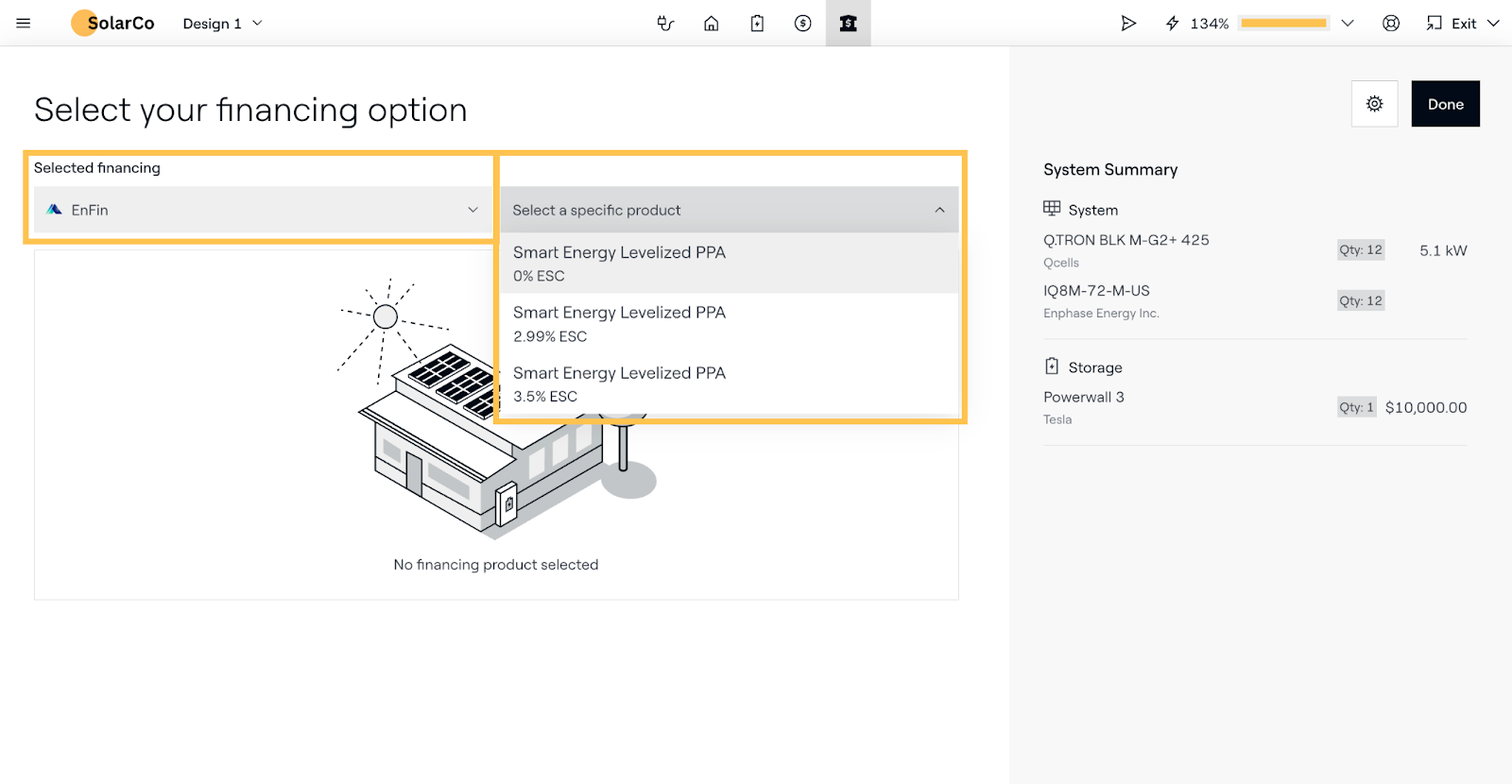 On the Financing tab, use the Select financing dropdown menu to select EnFin, then use the second dropdown to select a TPO product — available products will be pre-filtered based on the utility market/state in which the project is located, as well as your organization’s approvals with EnFin.