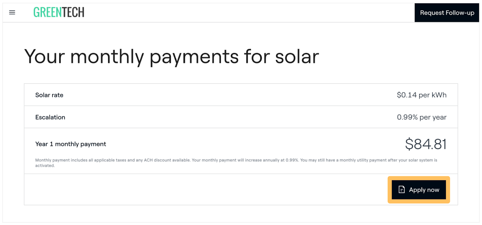- Estimated monthly payment – the solar rate multiplied by consumption