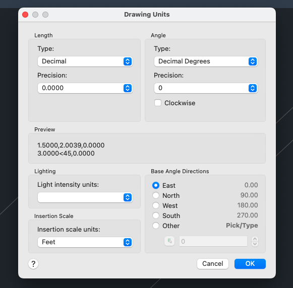 Within the Units dialog box, you have control over the unit of measurement used in your drawing. Choose Feet for Imperial or Meters for Metric measurements based on your project needs. This option ensures all dimensions and scaling match the required unit system.