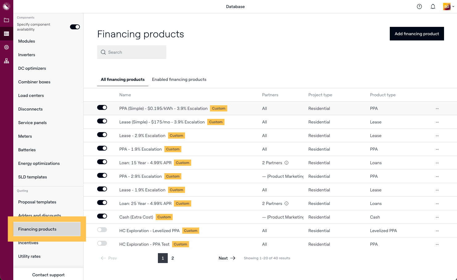 Financing products are templates that account admins create to model the financial options your team presents to homeowners — loans, leases, power purchase agreements (PPAs), and cash. Once configured, financing products appear in Sales Mode so reps can present accurate payment structures without manually entering rates each time.