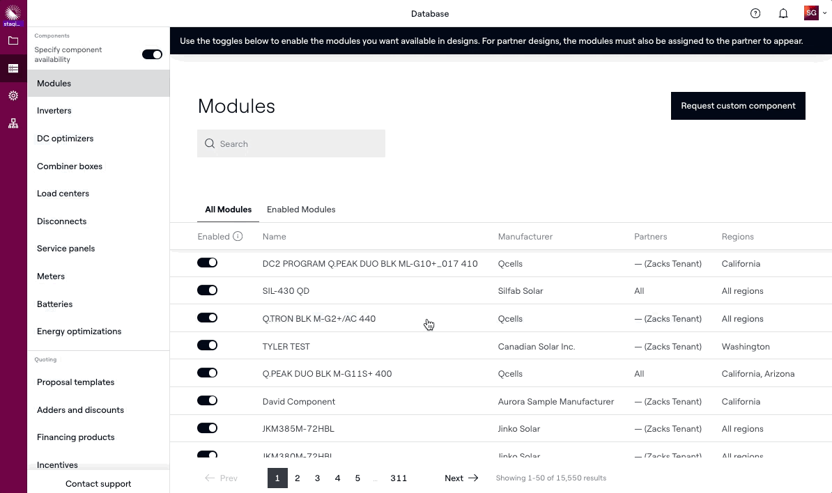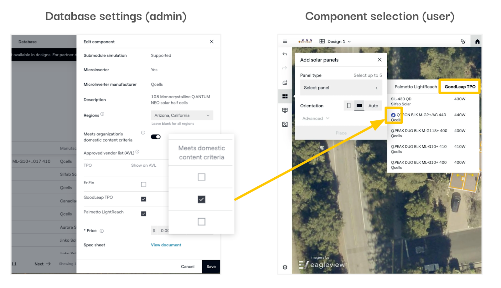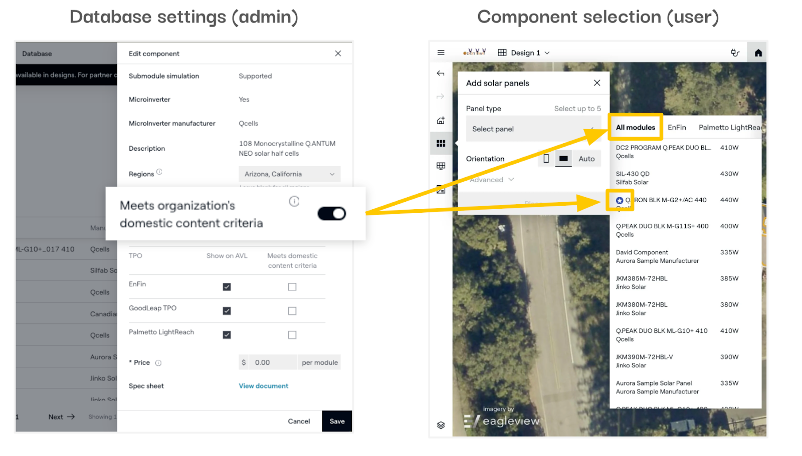 Component visibility settings allow admins to control which solar components are available to their teams based on location, financier requirements, and domestic content guidance. These settings help to ensure that sales reps and designers only see components that are appropriate for a given project to reduce risk, avoid financing issues, and increase user confidence during design and quoting.