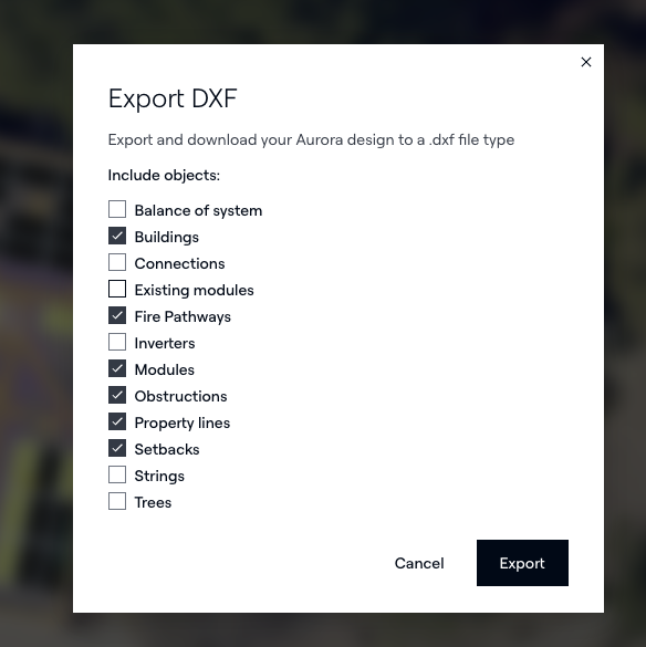 Aurora te permite exportar el diseño de tu sistema como un archivo DXF, un formato CAD estándar compatible con AutoCAD y otras herramientas de diseño. Usa las exportaciones DXF para compartir tu diseño con ingenieros estructurales, equipos de permisos o cualquier flujo de trabajo que requiera dibujos listos para CAD.