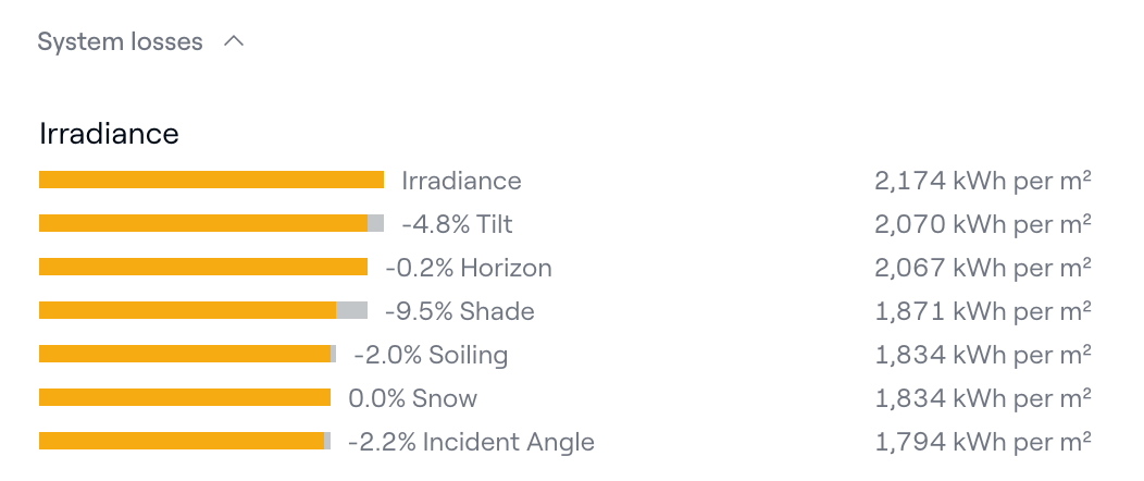 Si ejecutas una simulación con el motor de sombreado desactivado, la pérdida por sombra mostrada aquí refleja la reducción manual por sombra que configuraste en tus ajustes de pérdidas del sistema.