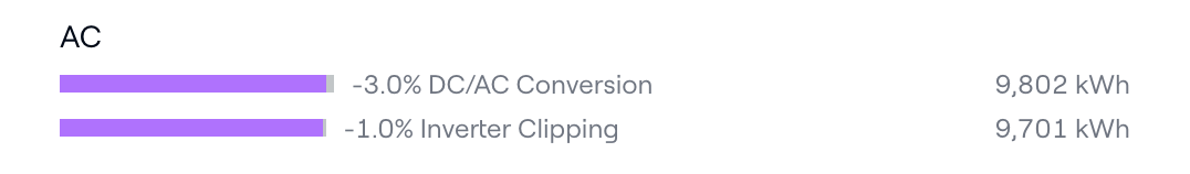 Porque Aurora modela la curva completa de eficiencia del inversor (cuando hay datos de prueba disponibles), la pérdida mostrada aquí refleja condiciones reales de operación durante el año, no solo la eficiencia nominal. Una pérdida alta en la conversión CC/CA puede indicar que el arreglo está significativamente subdimensionado respecto a la potencia nominal del inversor.