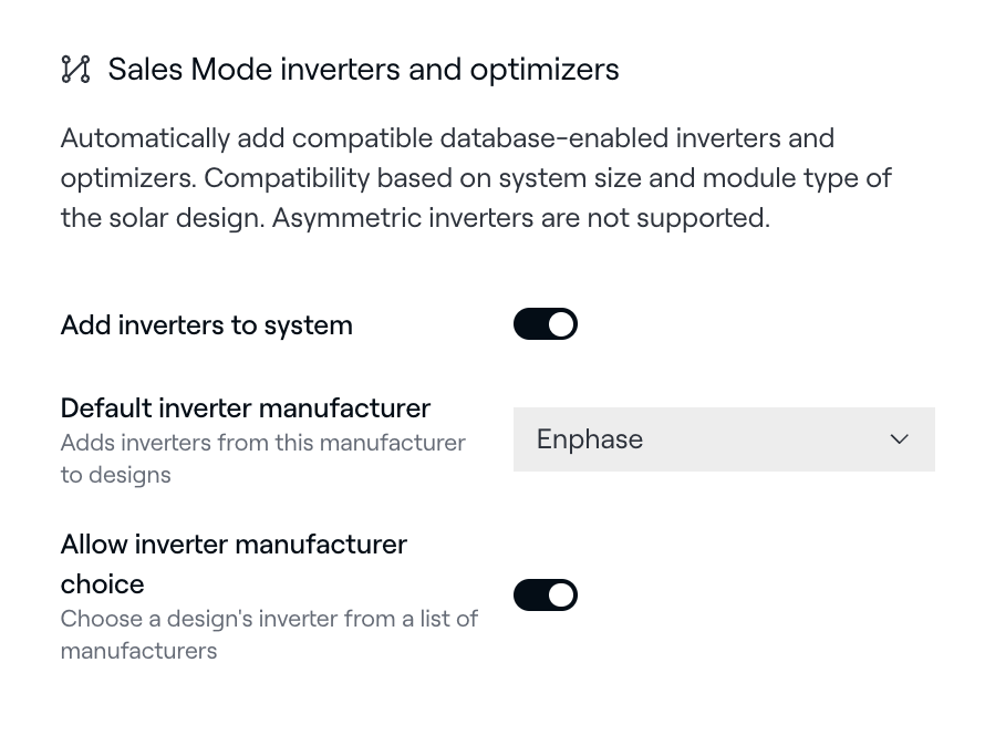 A continuación, vaya a Configuración > Diseño. Haga clic en Editar y vaya a la sección Modo de venta inversores y optimizadores sección. Conmutar ON el Añadir inversores al sistema y seleccione un fabricante de inversores predeterminado que se encuentra en la AVL de EnFin. Si en su base de datos está habilitado más de un fabricante de inversores, los usuarios del Modo Ventas podrán elegir entre esos fabricantes.