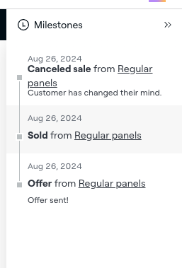 Si marca un diseño como Cancelado, aparecerá como Oferta cancelada, Venta cancelada o Instalación cancelada en la vista de la línea de tiempo para indicar claramente el hito anterior.